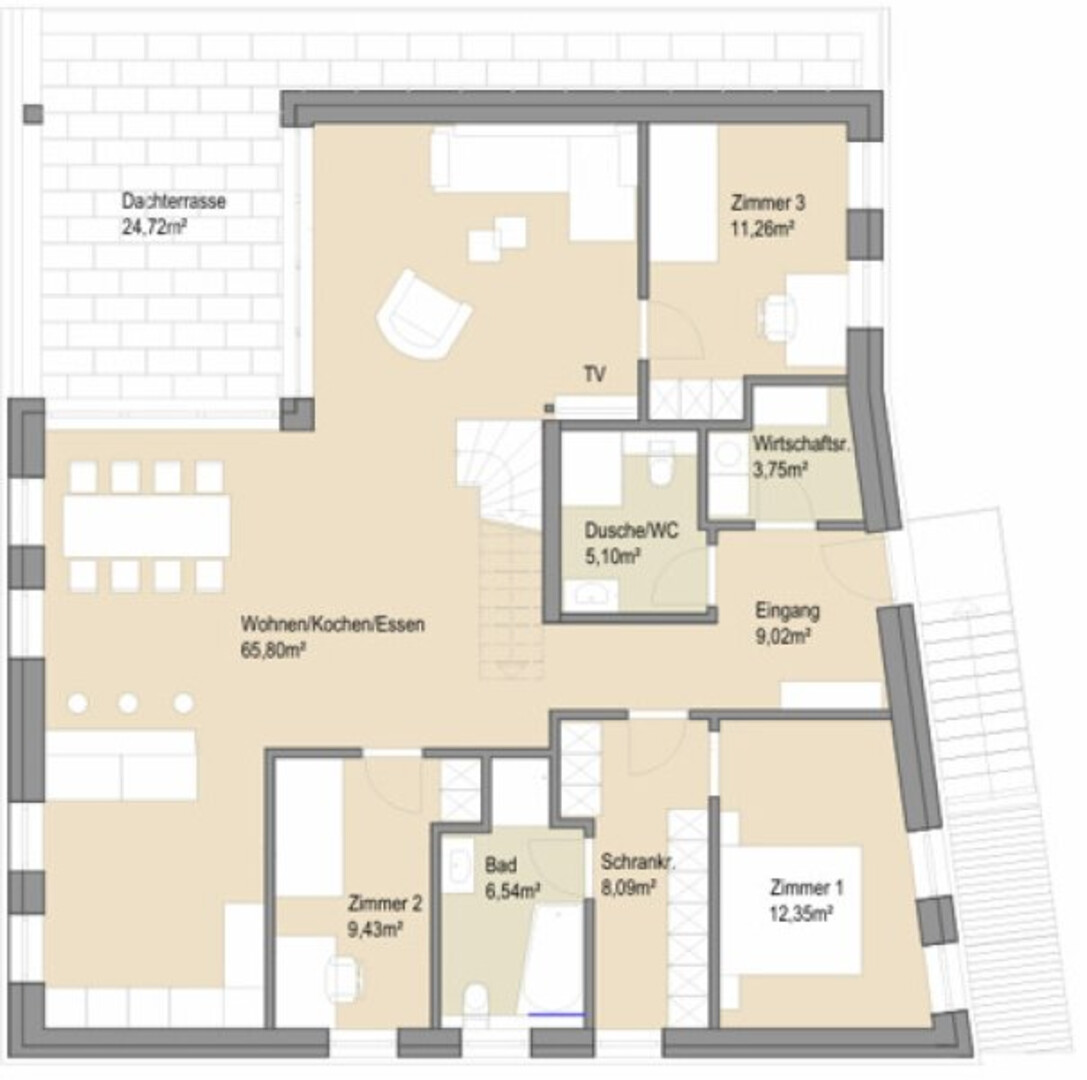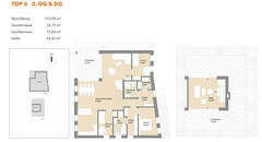 Die letzte noch verfügbare Wohneinheit, die Penthouse-Wohnung unterteilt sich im 2. Obergeschoß in einen wirklich großzügigen Wohn-Kochbereich mit ca. 65,68 m² und herrlichen Ausblicken, sowie der Möglichkeit auf der direkt angrenzenden Terrasse zu essen, zu grillen etc. Auf dieser Ebene gibt es 3 Schlafzimmer, geschickt von einander räumlich getrennt, sowie 2 Badezimmer und einen begehbaren Schrankraum. Der Eingangsbereich ist großzügig gestaltet und bietet viel Stauraum. Sehr praktikabel der Wirtschaftsraum mit einer Größe von ca. 3,75 m².