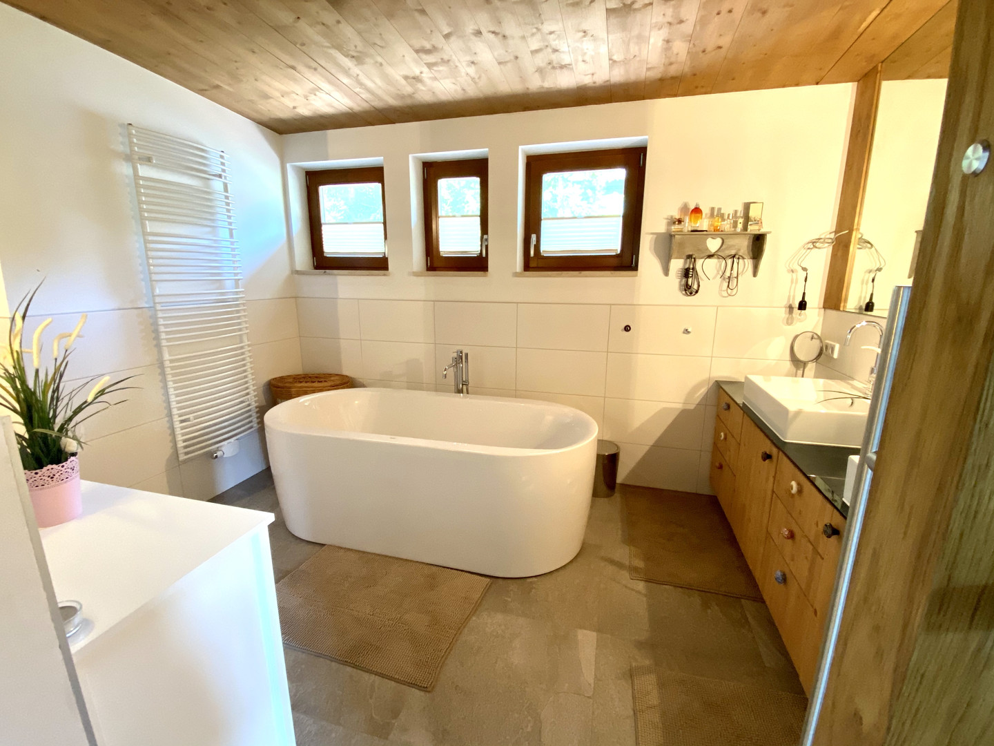 großes Familienbad mit 2 Waschbecken, Dusche, Badewanne, Toilette und Waschmaschinenanschluss