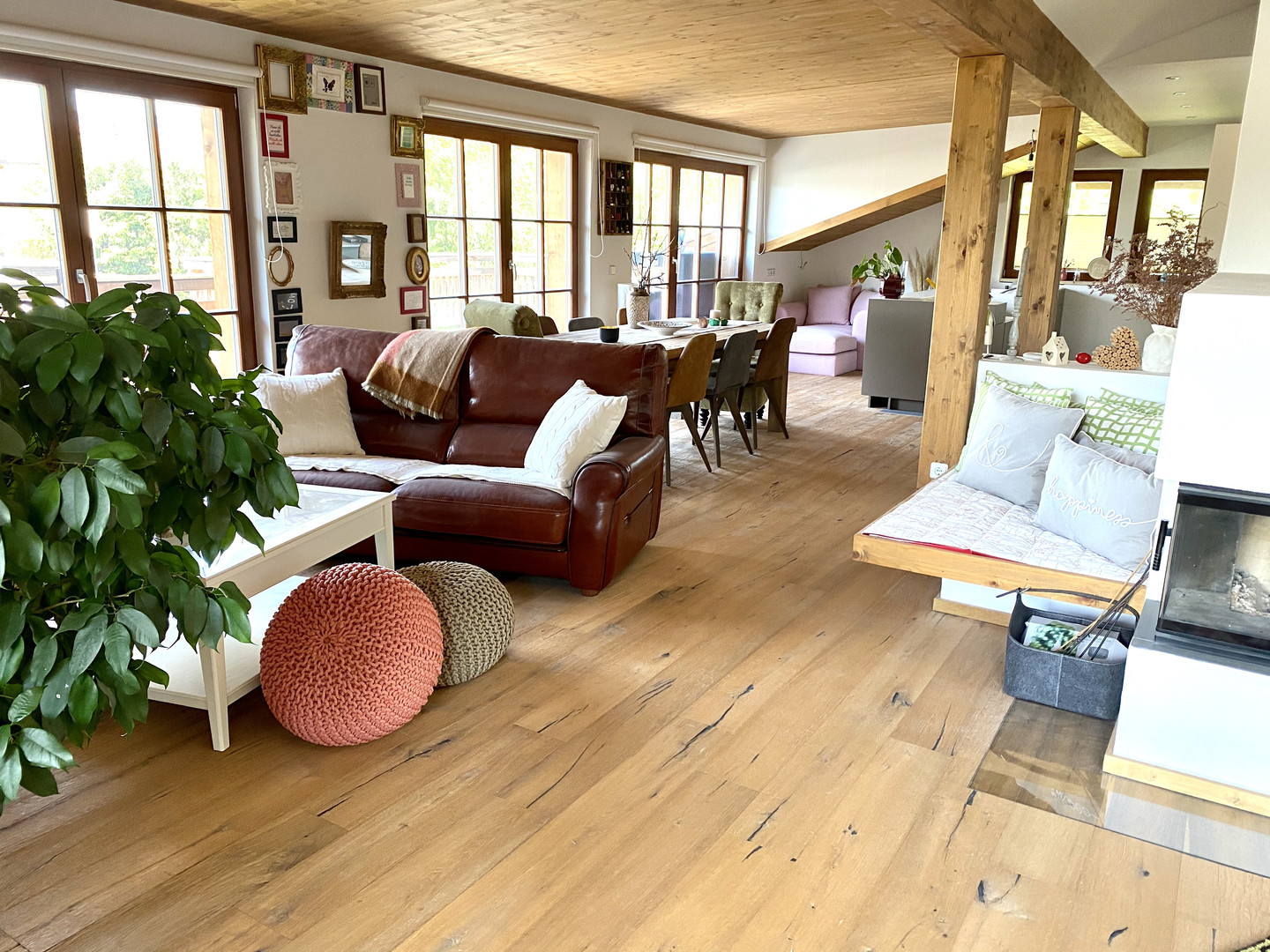 großes helles lichtdurchflutetes Wohnzimmer mit Couchecke, Esstisch und