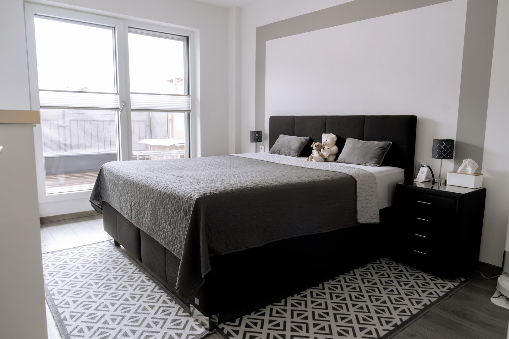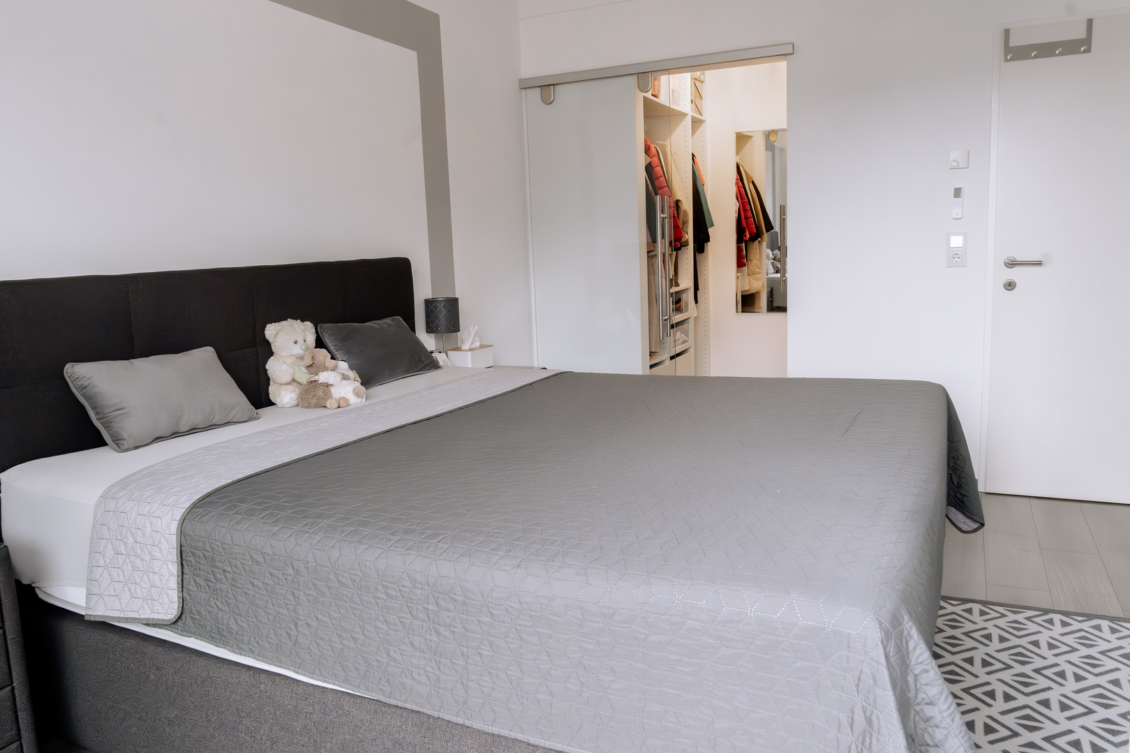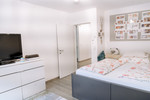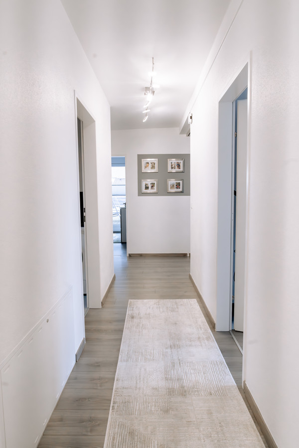 Die Penthousewohnung verfügt über insgesamt vier Zimmer, darunter ein großzügiges Schlafzimmer mit angrenzendem Schrankraum, ein stilvolles Badezimmer mit Badewanne und Dusche, sowie ein separates Gäste-WC. Ein zusätzlicher Abstellraum sorgt für Alltagstauglichkeit ohne Abstriche beim Design.