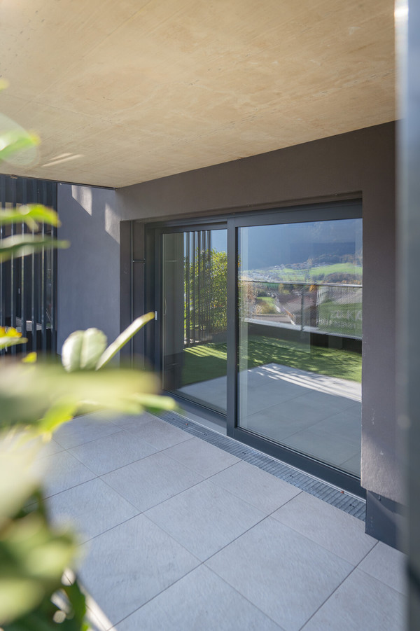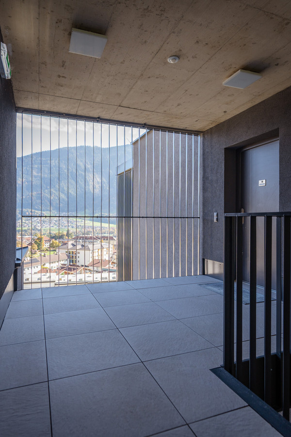 Das im Jahr 2022 errichtete Wohnhaus mit nur 13 Einheiten besticht durch moderne Architektur, klare Linien und eine dunkle, elegante Fassadengestaltung. Ein Projekt, das Ruhe ausstrahlt – und dennoch durch seine Präsenz auffällt. Jede Wohnung verfügt über eine private Terrasse, Panoramaverglasung, Garage und den Zugang über Lift in alle Ebenen. Eine gemeinschaftliche Dachterrasse steht allen Bewohnern als Rückzugsort offen – mit Blick über das Inntal und die umliegende Bergkulisse. Beheizt wird über eine Gas-Zentralheizung mit Fußbodenheizung in allen Einheiten – effizient, komfortabel, wartungsarm.