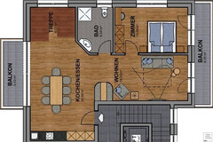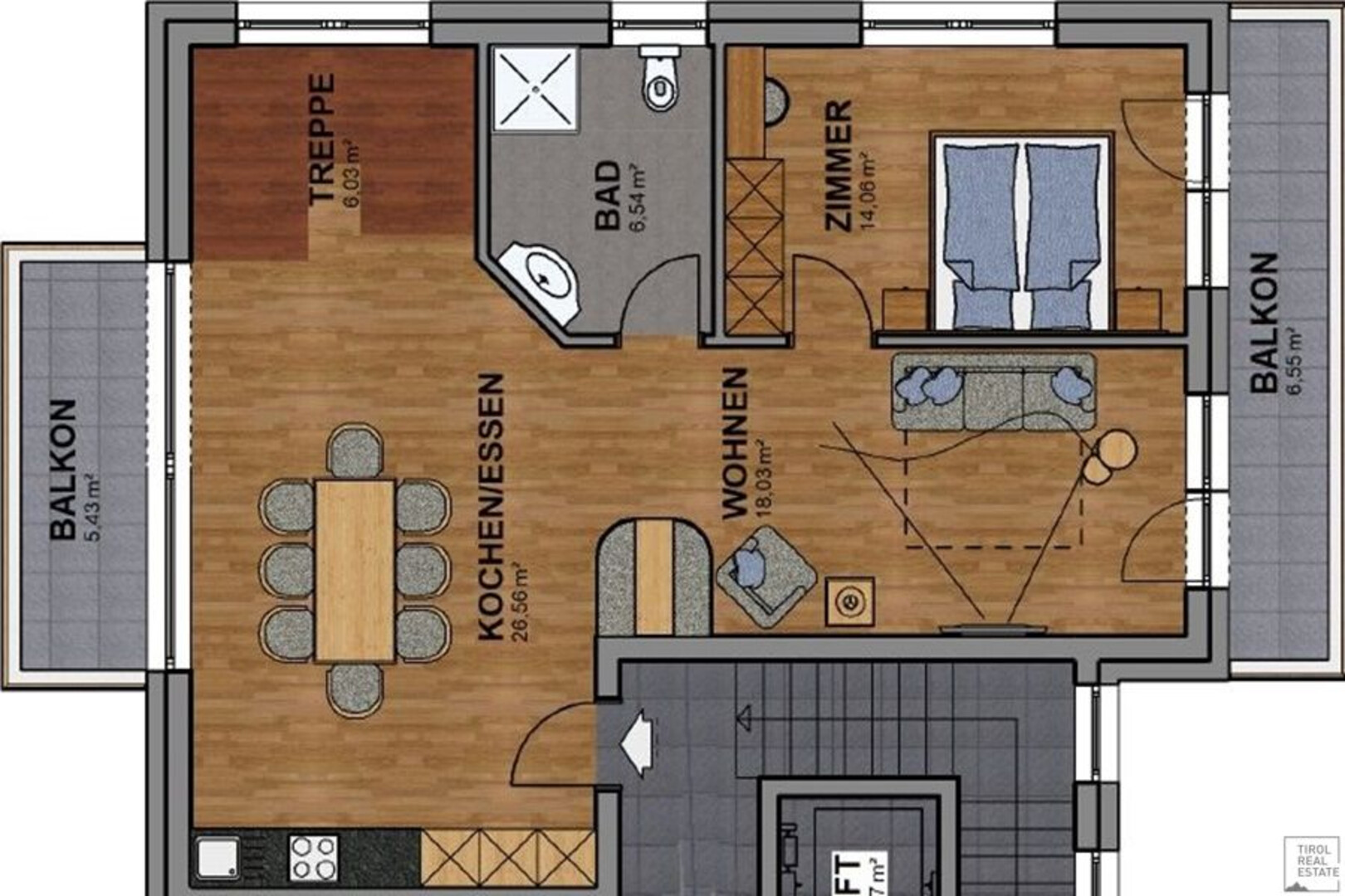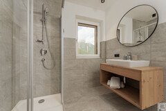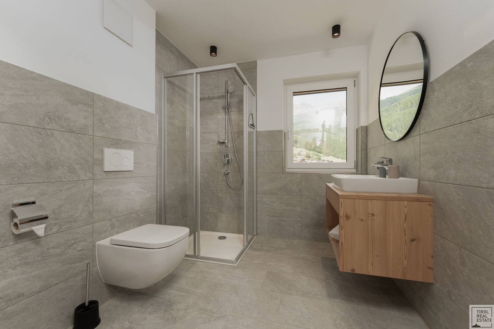 Das moderne Badezimmer ist mit einer großzügigen Dusche, einem WC und stilvollen Elementen ausgestattet. Zwei Balkone, mit einer Fläche von 5,43 m² und 6,55 m², erweitern den Wohnraum ins Freie und bieten herrliche Ausblicke – ideal, um den Tag mit einem Kaffee zu beginnen oder den Abend entspannt ausklingen zu lassen.