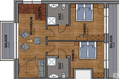 Das Obergeschoss ist ebenso ansprechend gestaltet und verfügt über zwei großzügige Schlafzimmer. Beide Räume bieten Zugang zu einem weiteren Balkon, der mit 7,95 m² zusätzlichen Freiraum schenkt. Zwei moderne Badezimmer bieten Komfort und Privatsphäre für alle. Der zusätzliche Wohnraum im Obergeschoss bietet vielseitige Nutzungsmöglichkeiten, sei es als weiterer Wohnbereich oder Rückzugsort.