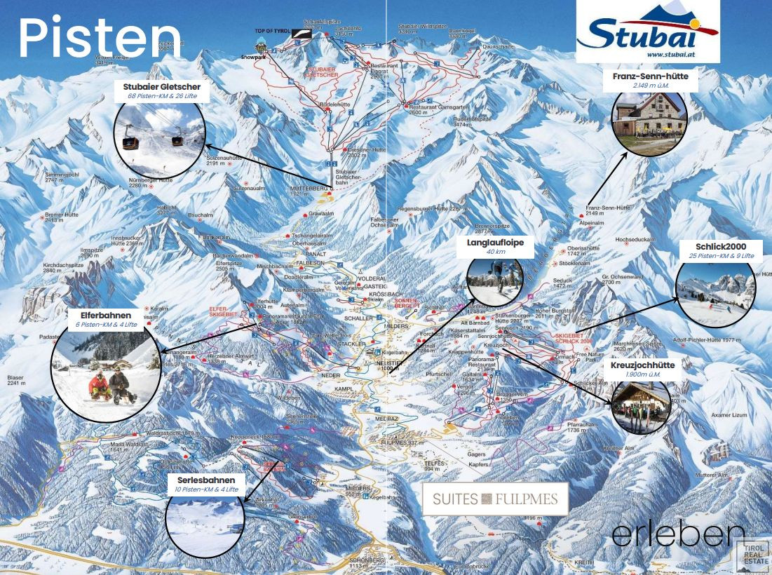 Vier Skigebiete bescheren jährlich zahlreichen Wintersportlern unvergessliche Skimomente. Erleben Sie einen abwechslungsreichen Winterurlaub am Stubaier Gletscher mit vielfältigem Sportangebot und Schneegarantie von Oktober bis Mai, im Skizentrum Schlick 2000 mit vielen urigen Hütten und Abfahrt bis ins Dorf, bei den Elferbahnen mit dem fulminanten Rodelangebot bei Tag und bei Nacht und bei den Serlesbahnen mit dem idealen Pisten-, Rodel- und Winterwandererlebnis für Familien und Anfänger.