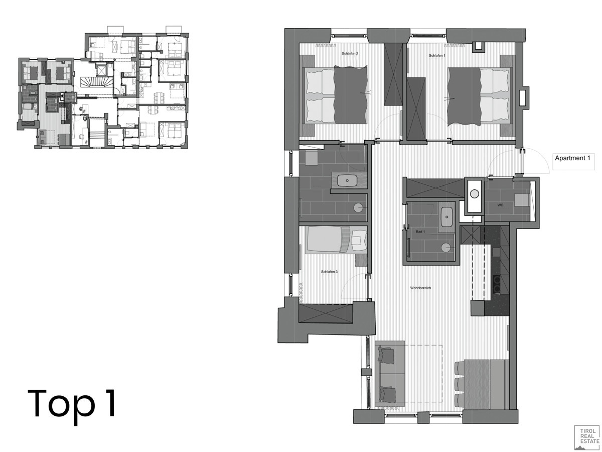 Das Apartment Top 1 ist eine charmante Residenz mit ca. 69 m², bestehend aus drei Schlafzimmer, einem Wohnzimmer mit Einbauküche und zwei stilvollen Badezimmer. Die hochwertige Ausstattung und elegante Möblierung bieten höchsten Wohnkomfort und Stil.