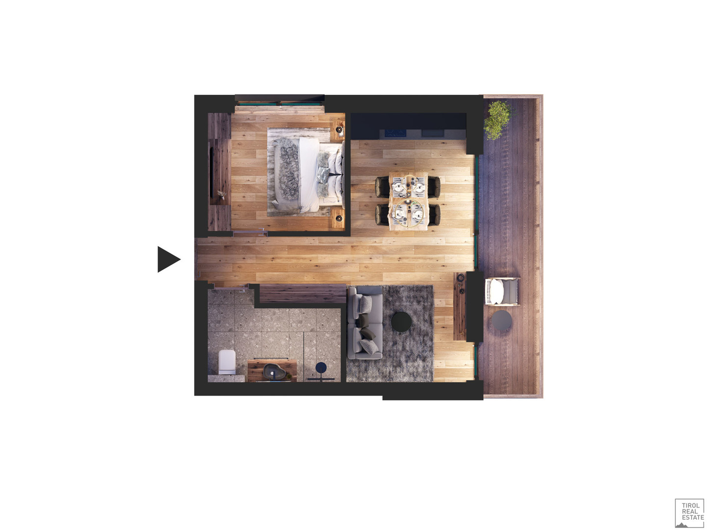 Beim Betreten des Apartments bringt Sie ein geräumiger Eingangsbereich, vorbei an Badezimmer und Schlafzimmer, in den offenen und großzügigen Wohn-Essbereich. Diese offene Raumkonzeption schafft eine einladende und gemütliche Atmosphäre für gemeinsame Mahlzeiten und geselliges Beisammensein.