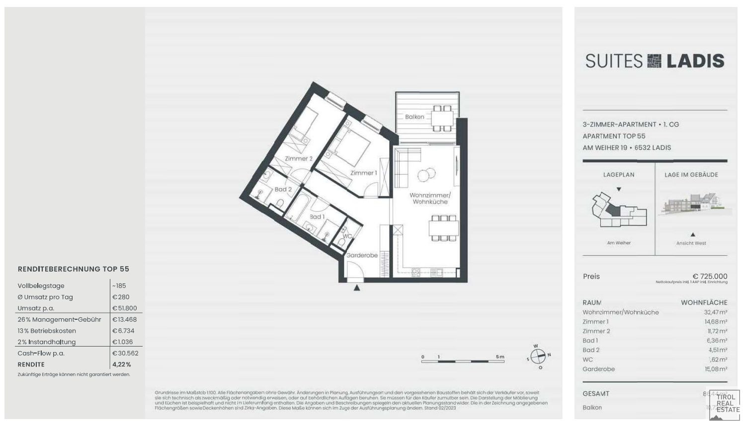 Kosten für die Errichtung des Kaufvertrages und Treuhandschaft lt. Anwaltstarif zzgl. BarauslagenWillkommen auf der Sonnenseite der Tiroler Urlaubswelt: Auf einem sonnigen Hochplateau über dem Tiroler Oberinntal, umgeben von eindrucksvollen 3 000ern, bietet der kleine Ort Ladis ein einzigartiges Urlaubsangebot. Die Tourismusregion Serfaus-Fiss-Ladis gilt als Trendsetter in Sachen Familienfreundlichkeit. Sie ist bekannt für eine herausragende Winterkulisse mit ausgewogener Pistenlandschaft, für vielfältige Sommer-Highlights inmitten imposanter Bergwelten – und für über 2 000 Sonnenstunden im Jahr. Wer in Tirol Spaß, Abenteuer und Erholung sucht, wird Ladis finden.