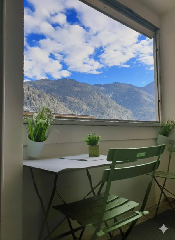 Die gesamte Einheit besticht durch eine helle, einladende Atmosphäre. Ein Balkon mit Blick in den ruhigen Innenhof mit Garten sowie auf die umliegende Bergwelt lädt zum Entspannen ein. Die Ausstattung ist nagelneu und perfekt auf die Bedürfnisse von Studierenden oder berufstätigen Pendlern zugeschnitten („Komplettausstattung“).
