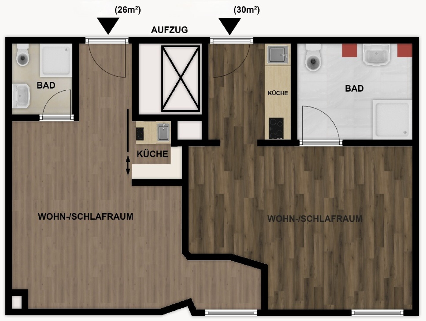Die Garconnièren befindet sich in einem Hochhaus im 4.Stock. Die Wohnungen sind im Grundbuch als eine Einheit verbucht. Sie verfügen über 1 Gang, 1 Bad mit 1 Toilette und 1 Hauptraum mit Küchenzeile bzw. Küchenecke.