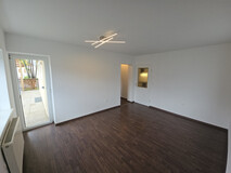 Die Wohnung verfügt über einen offenen Kochbereich mit Einbauküche sowie einen großzügigen Wohn- und Essbereich mit direktem Zugang zur Terrasse und in den Garten. Zwei gut geschnittene Schlafzimmer bieten ausreichend Platz für individuelle Wohnbedürfnisse. Das Badezimmer ist mit einer Dusche ausgestattet und verfügt über ein Fenster. Ergänzt wird das Raumangebot durch eine separate Waschküche.