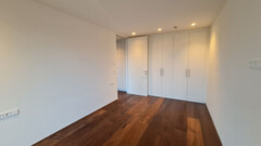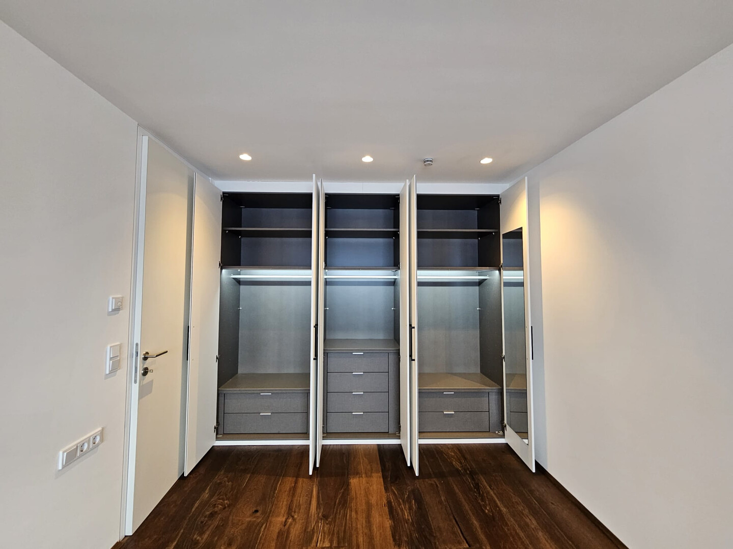 - Im Schlafzimmer ist der Kleiderschrank (beleuchtet mit Spiegeln) bereits fertig eingebaut.