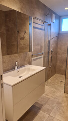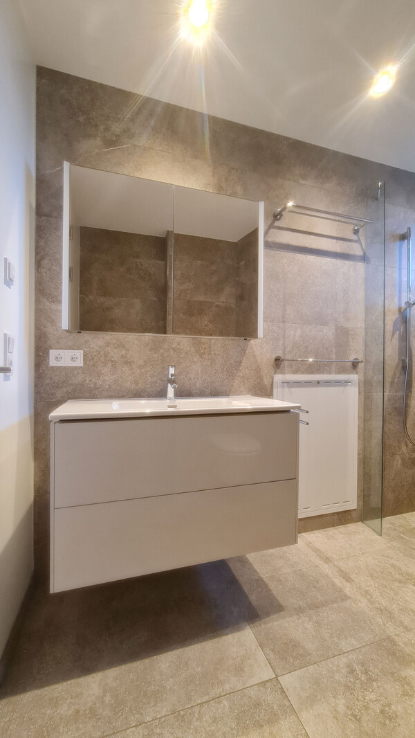 - Bad mit öffenbarem Fenster, bodenbündiger Dusche und Ganzglas-Duschabtrennung (Waschbecken mit Schubladenauszügen und doppelt beleuchteter Spiegelschrank mit Steckdosen sowie alle Badaccessoires sind schon eingebaut)