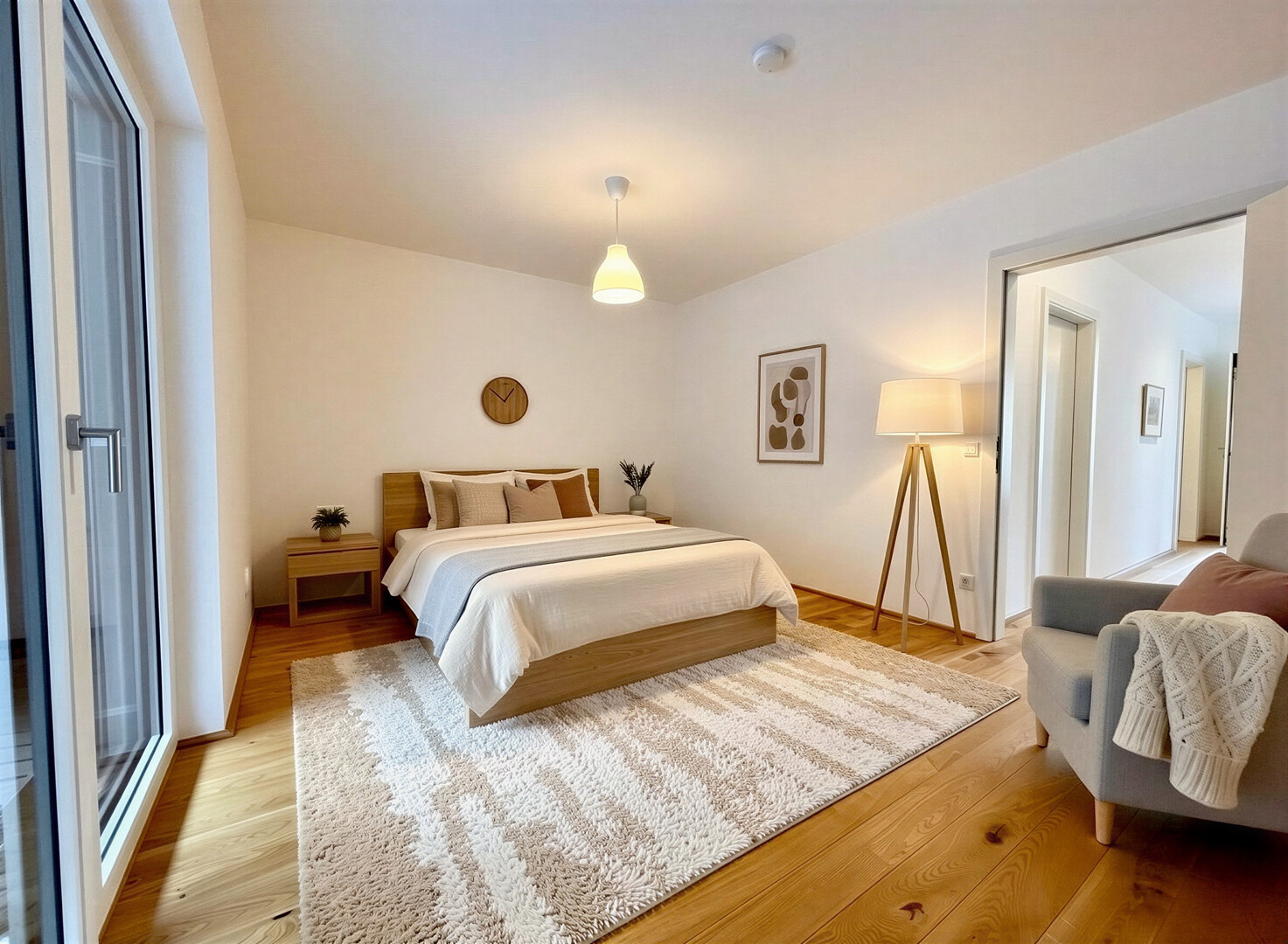 Der durchdachte Grundriss bietet drei komfortable Schlafzimmer sowie einen Wohn- und Essbereich mit direktem Zugang zur Südterrasse und dem privaten Gartenbereich. Bodentiefe Fensterflächen sorgen für ein lichtdurchflutetes Wohnambiente und ein besonders angenehmes Raumgefühl.