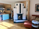 Lässiger gemauerter Ofen mit Sichtfenster auf die heimeligen Flammen