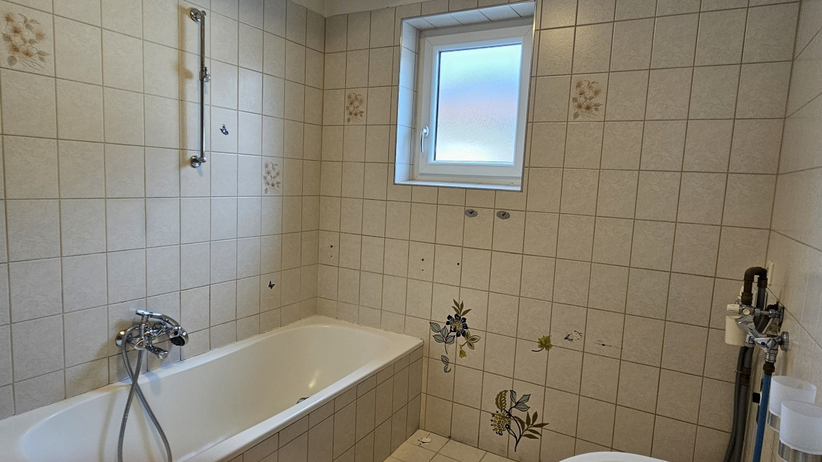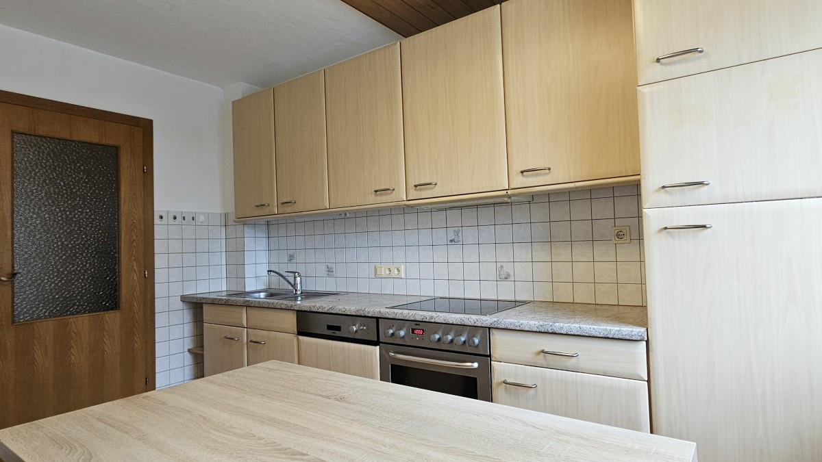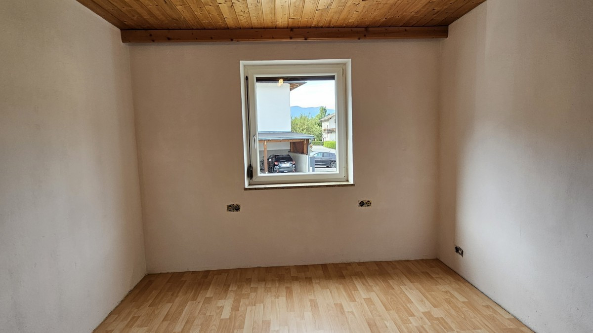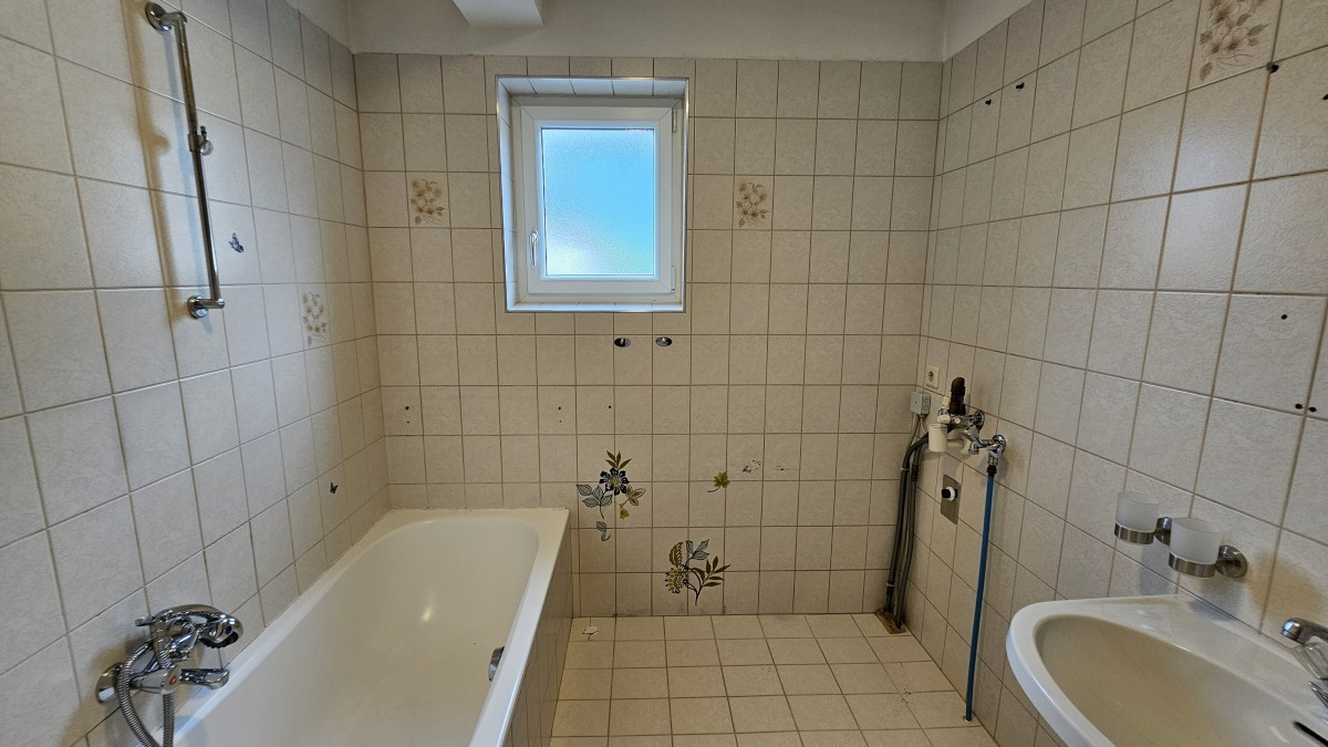 Die im Erdgeschoß befindliche Wohneinheit besteht aus einer Diele, einem großzügigen Wohnraum mit Kachelofen, einer separaten Küche mit eingebauter Küchenzeile, Gang, Elternschlafzimmer, 2 Kinderzimmern, einem Bad mit Fenster und einem eigenen WC.