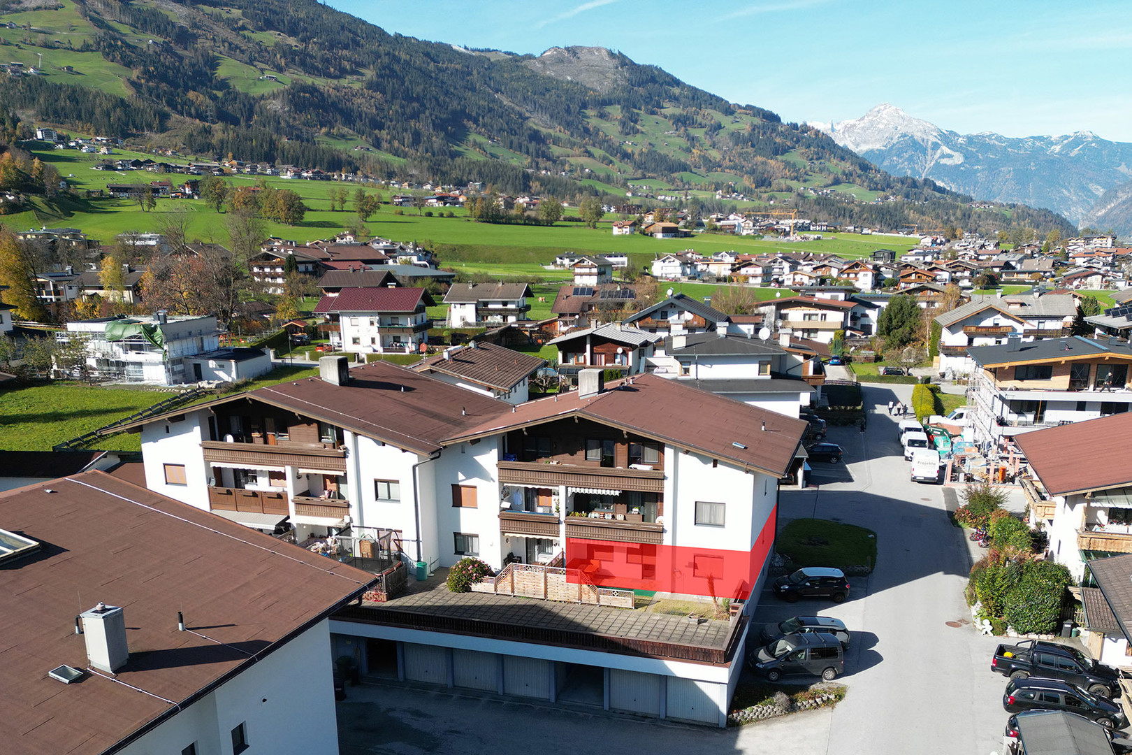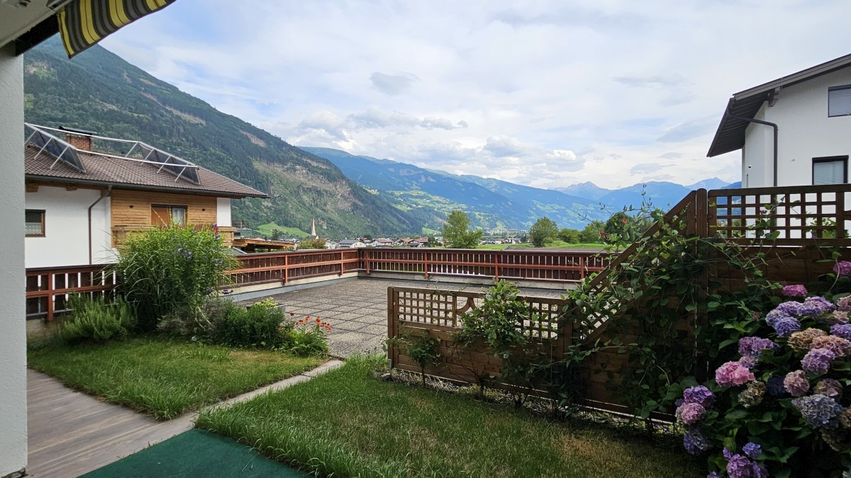 Die Wohnung verfügt weiters über eine großzügige Südterrasse von 8,25 m² und einem kleinen Gartenanteil von 27,42 m², die Ihnen einen herrlichen Blick ins hintere Zillertal sowie den nahen Golfplatz bietet – perfekt für entspannte Stunden im Freien.