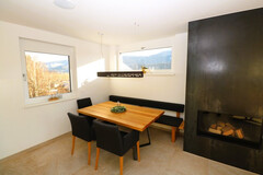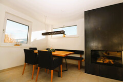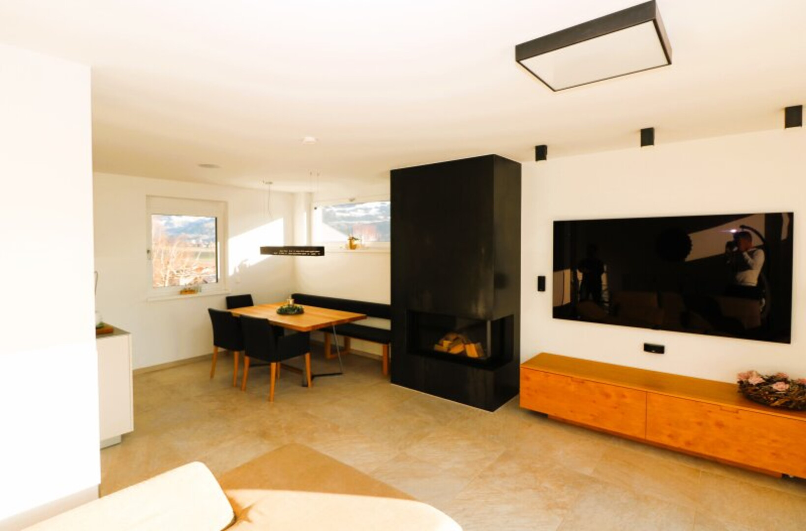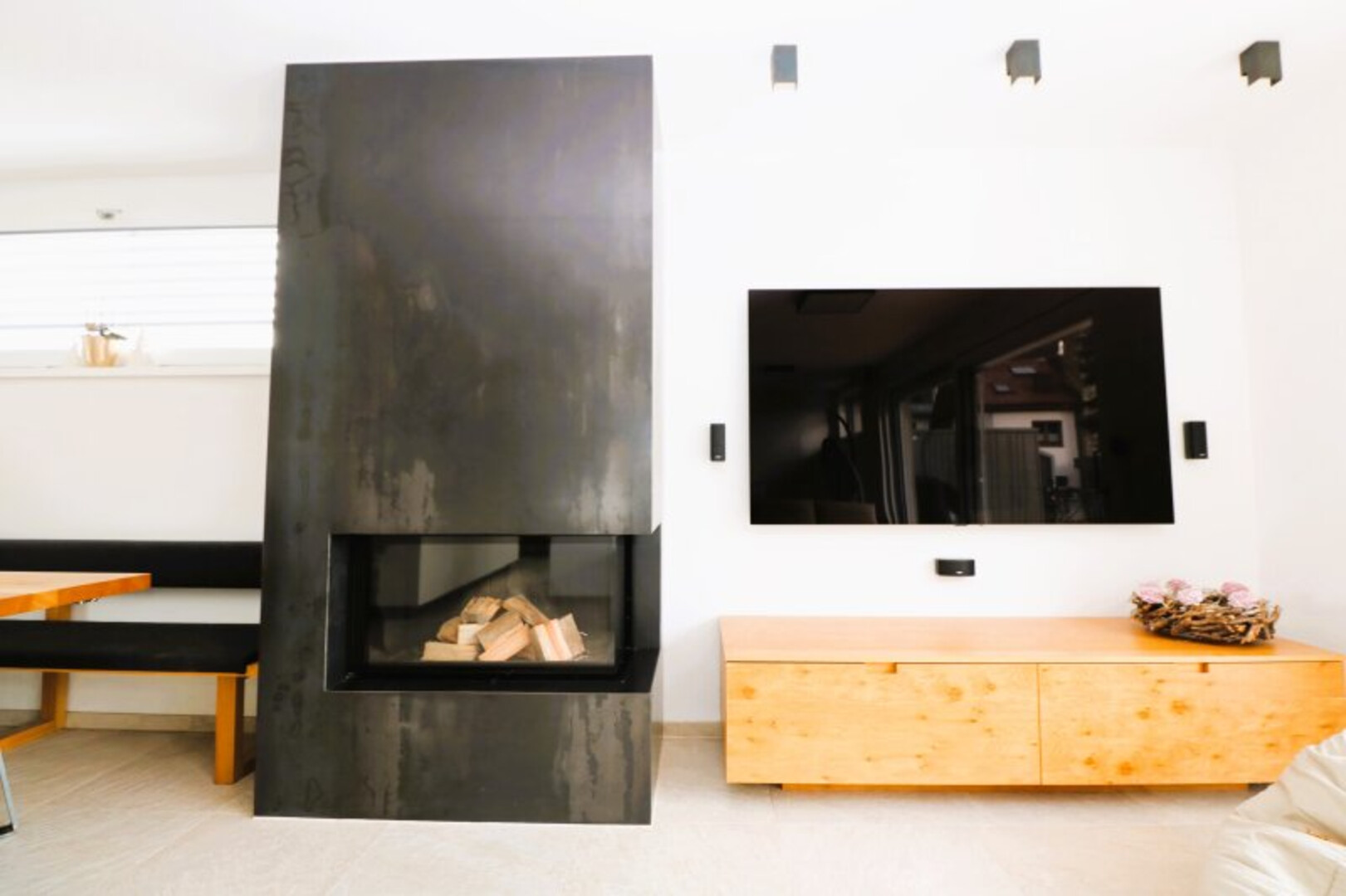 - Der Wohnbereich ist ein heller und einladender Raum mit einem gemauerten und Stahl verkleideten Kamin, der für eine angenehme Atmosphäre sorgt.