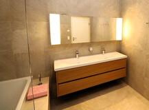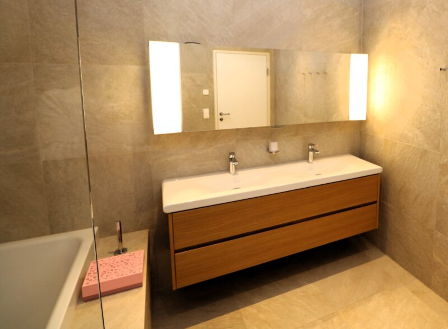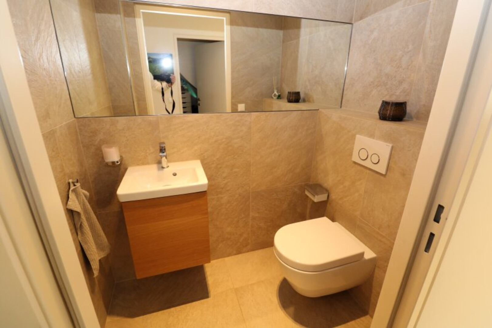 Anschlussmöglichkeit für ein Doppelwaschbecken (Waschbecken, Spiegel und Badmöbel nicht im Kaufpreis inkludiert). - Separates WC mit Handwaschbecken für zusätzlichen Komfort.