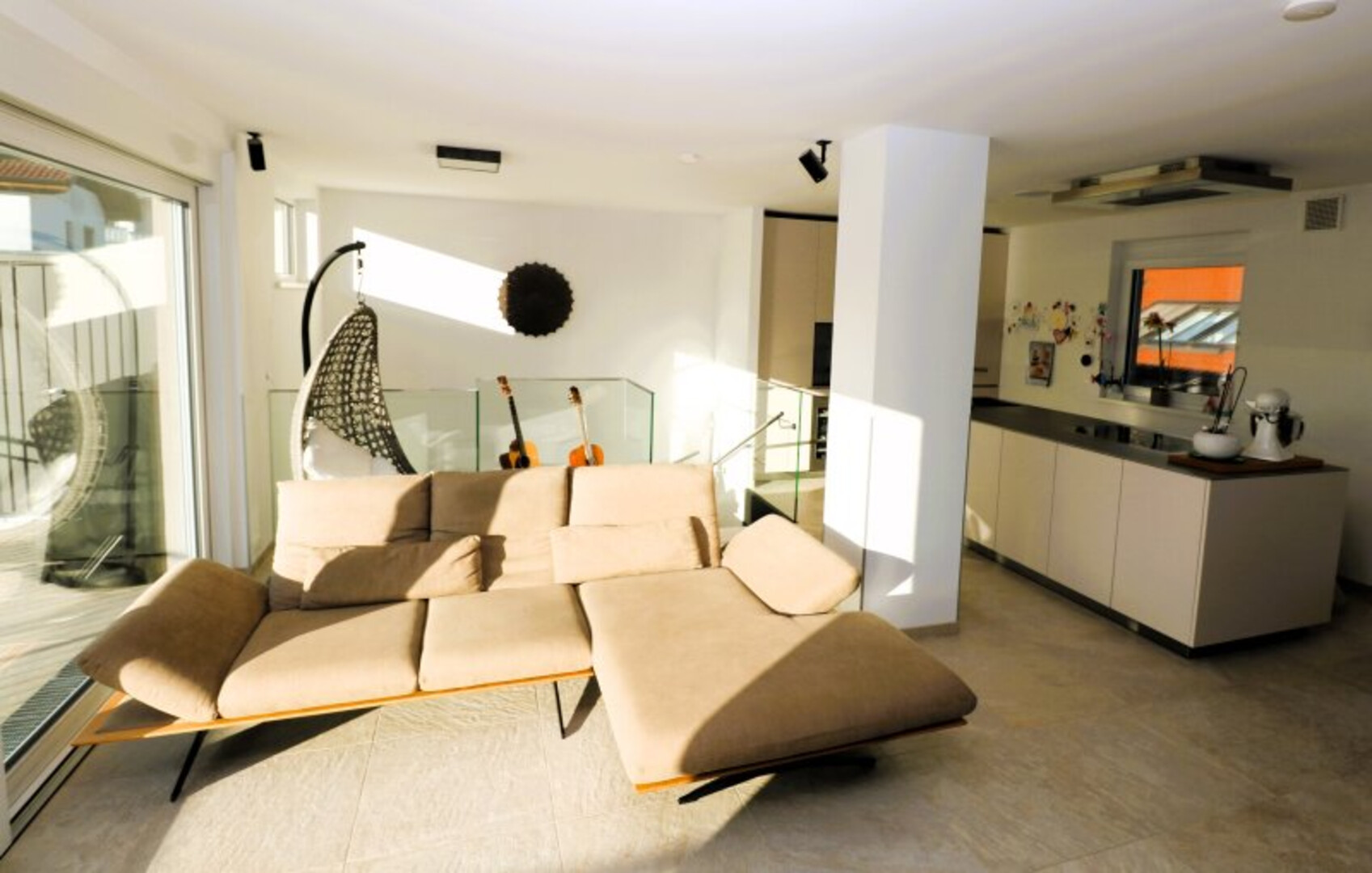 Der Wohnbereich im Dachgeschoß besticht durch seine offene, lichtdurchflutete Gestaltung und hochwertige Ausstattung: