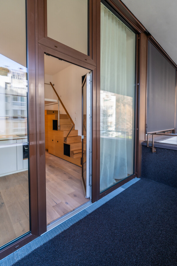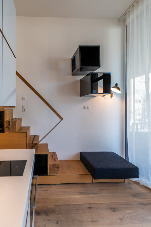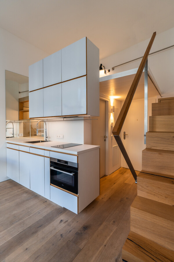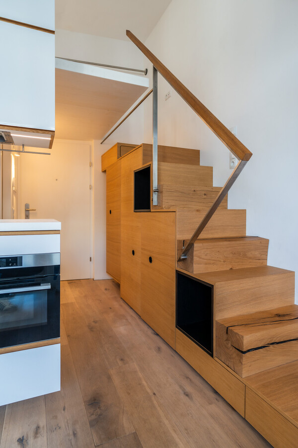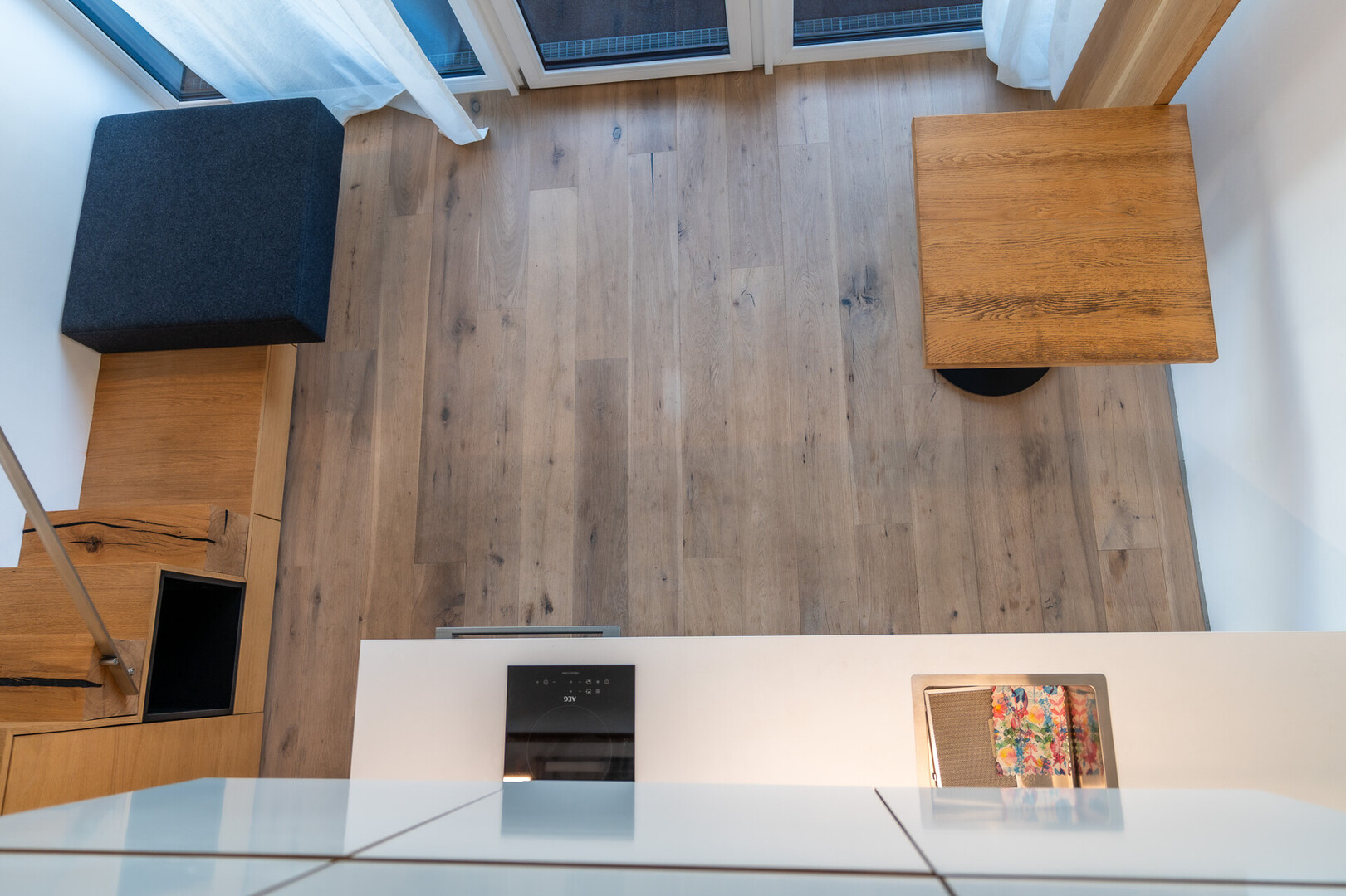 Besonders prägend ist die individuell gefertigte Möbelstiege, die Wohnraum und Schlafgalerie verbindet und gleichzeitig großzügigen Stauraum bietet. Die Galerie schafft einen gemütlichen Rückzugsort, während die integrierte Relax-Zone dem Wohnbereich zusätzliche Qualität verleiht. Der vorgelagerte Balkon erweitert den Wohnraum ins Freie und bietet einen angenehmen Platz für Sonne und frische Luft mitten in der Stadt.