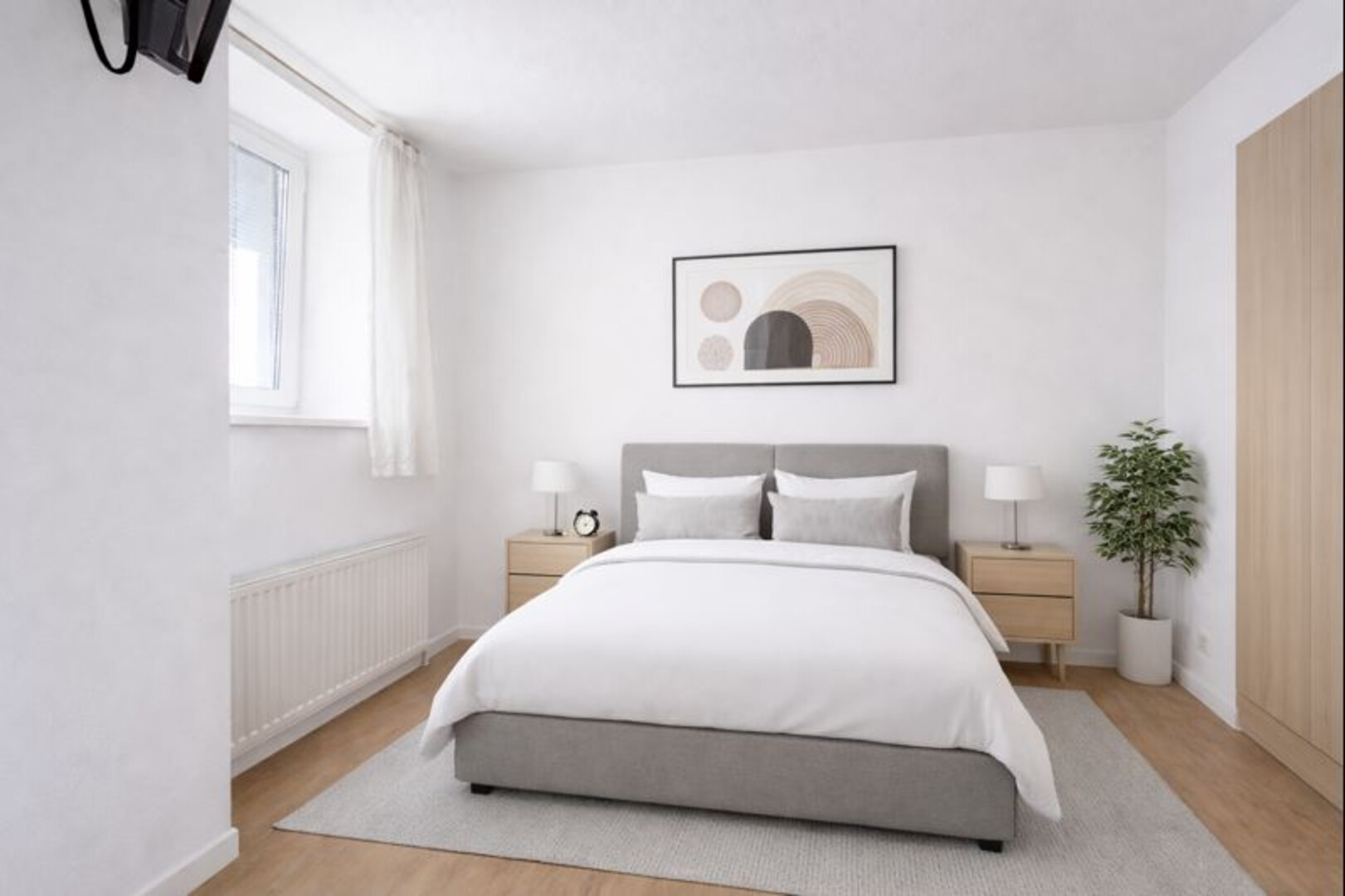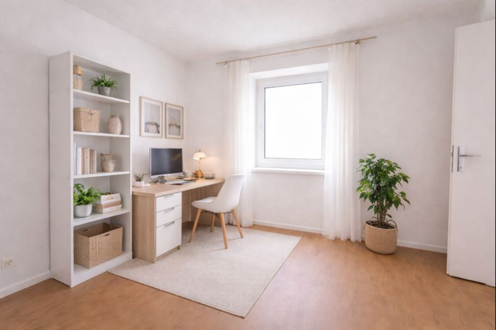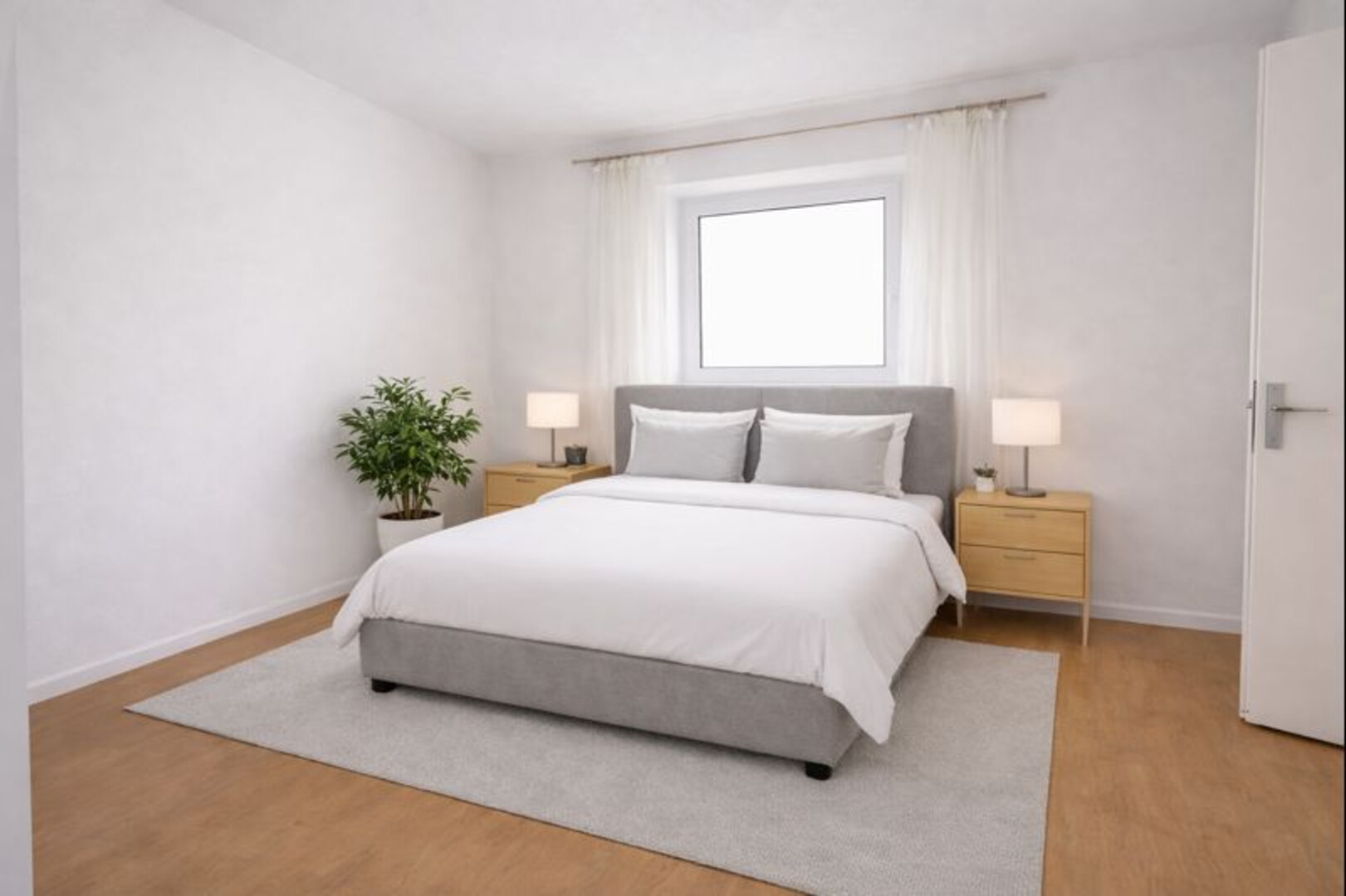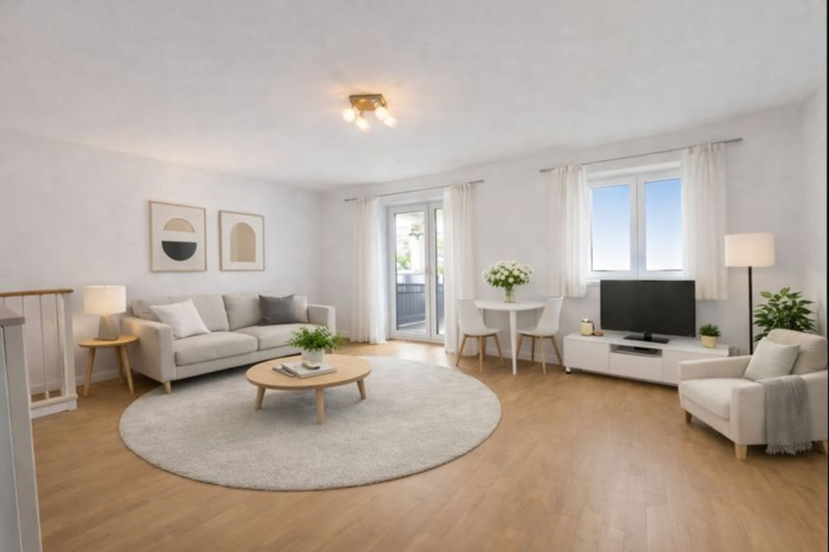 Zur besseren Erlebbarkeit der Größenverhältnisse wurde die Wohnung größtenteils virtuell geleert und anschließend virtuell gestaged, um Gestaltungsideen und Einrichtungsvarianten zu zeigen. Virtuell erstellte Bilder können leicht von der Realität abweichen.
