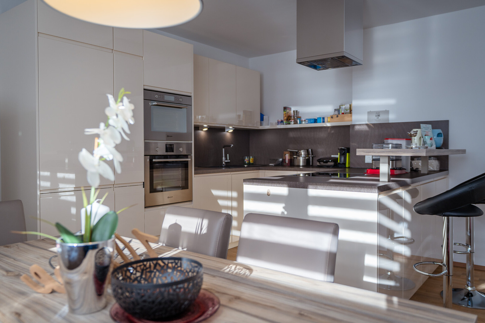 Die fast unbenutzte Küche, das durchdachte Beleuchtungskonzept und die geschmackvolle Einrichtung schaffen ein Wohngefühl, das gleichermaßen Ruhe, Stil und Leichtigkeit vermittelt.