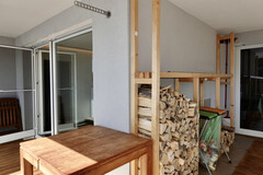 Die 3 Zimmer Penthouse Wohnung befindet in einem kleinen Mehrparteienhaus im 2. Stock ohne Lift. Die Wohnung verfügt über 1 Gang, 1 Schlafzimmer, 1 Durchgangszimmer zum Bad, 1 Badezimmer mit Doppelwaschbecken und Walk-In-Dusche, 1 extra Toilette, 1 Abstellkammer, 1 Wohnzimmer mit Kamin, 1 Küchennische, 2 Balkone, 1 Kellerabteil und 1 Doppelcarport mi E-Wallet.