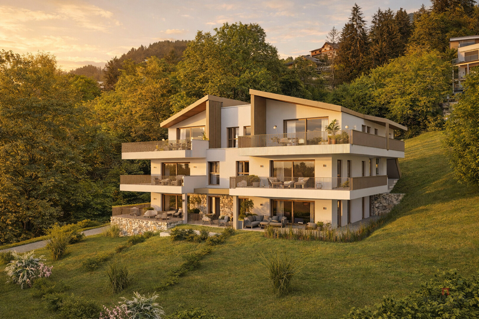 Der Anblick des nahezu unverbauten Südufers über die Dächer von Millstatt hinaus, versüßt das Wohnen an diesem Standort umso mehr und schafft eine wohltuende Erholungsatmosphäre. Die einzigartige Aussicht, kombiniert mit der idyllischen Lage am Waldrand, ermöglicht es den Bewohnern, jeden Tag die Schönheit der Natur zu genießen und eine erholsame Atmosphäre zu erleben. Die spektakuläre State-of-the-art-Architektur der Wohnungen auf dem Grundstück “GLANZleitn” beeindruckt mit ihrem unverwechselbaren Design.