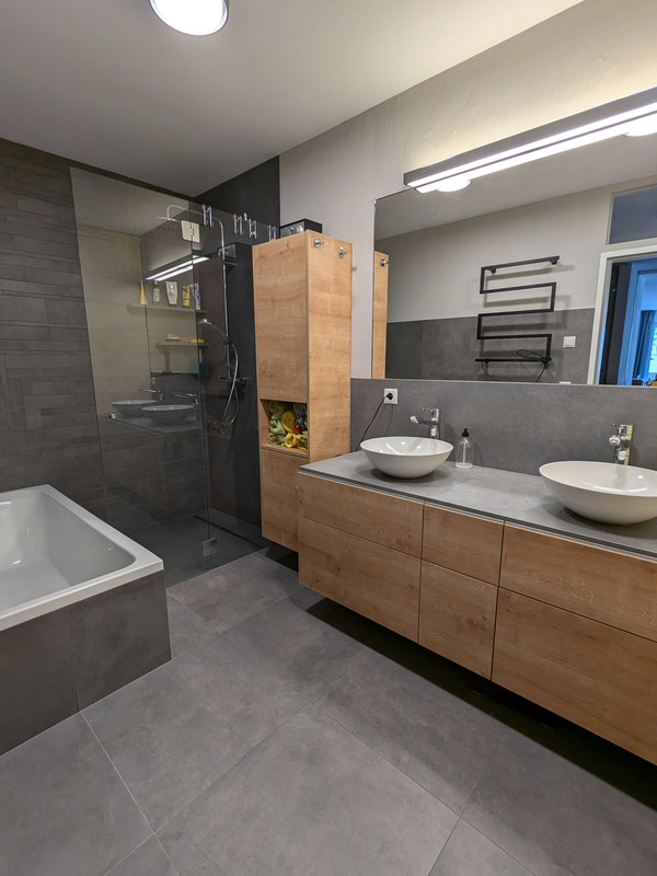 Wohnungsausstattung: moderne Einbauküche » Sonnenschutz und Fliegennetz an allen Fenstern (Terrassenseitig durch 2 Raffstore-Elemente und eine Fliegennetzschiebetür, Fenster mit Rollo und integriertem aufziehbaren Fliegennetz, Plissees an der Innenseite) » pflegeleichte graue Fliesen und hochwertiger Holzboden in Eiche » bestens eingerichtetes Bad mit Badewanne, Regendusche, Doppelwaschbecken, elektr. Handtuchheizkörper und Einbauschränke » funktionelle Einbauschränke in Garderobe und Gang » ausreichend Steckdosen und Lichtauslässe in der Wohnung, Terrasse, Keller und Garage » Internet und Satellitenanschlüsse » versteckte Schiebetür im Gang zur Raum bzw. Schalltrennung des Wohnraums zum Schlafbereich