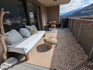 Terrasse: hochwertige Hebeschiebetür zur überdachten Terrasse mit frostsicherem Wasseranschluss und langlebigen Fliesen auf Aluschienen.