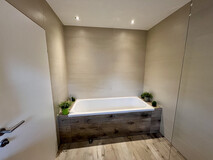 Badezimmer mit wandhoher Verfliesung, Badewanne und getrennte barrierefreie Dusche, Waschbecken, Fenster.