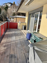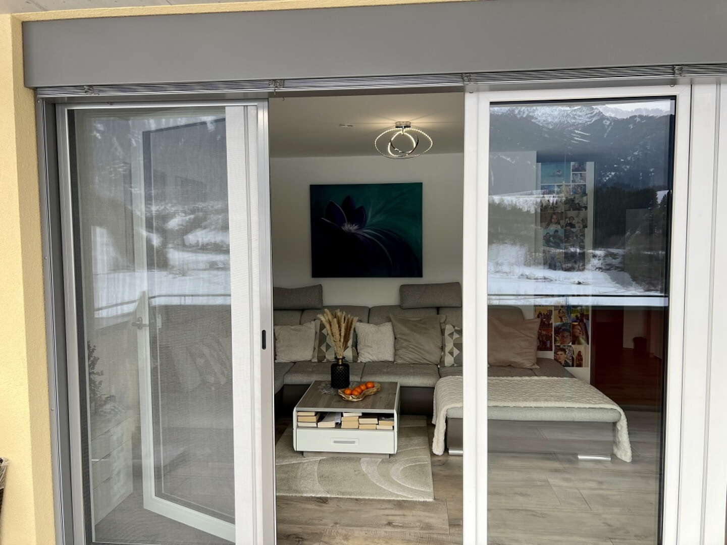 Die Wohnung befindet sich im Haus B im 2. (mittleren) Stockwerk und bietet 2 Schlafzimmer, einen großzügigen Wohn-Essbereich mit integrierter Einbauküche, ein modernes Badezimmer mit Dusche, Badewanne und Fenster, ein getrenntes WC, einen Vorraum und einen zusätzlichen Abstellraum, eine kleiner Westgarten/Terrasse vom Schlafzimmer aus betretbar und eine unvergleichliche Südterrasse mit unverbaubarem Fernblick auf die umliegende Bergwelt.
