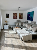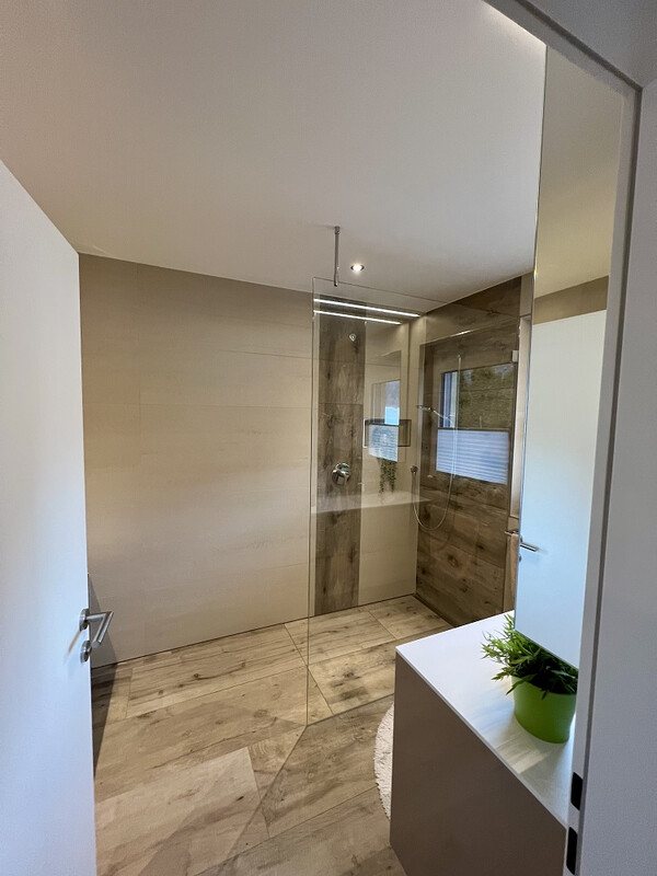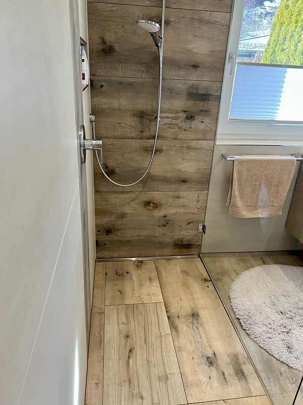 Großflächige Keramikfliesen in Holzoptik in allen Räumen und auf der Terrasse.