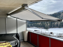 Weiße Kunststofffenster und Balkontüren mit Dreifachverglasung, elektrisch bedienbare Außenraffstores, weiße Innentüren mit Stahlzargen, zusätzlich eine elektrisch ausziehbare Sonnenmarkise auf der Terrasse.