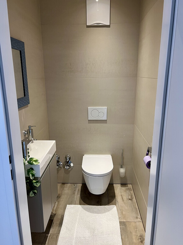Hand-Waschbecken, WC, wandhohe Verfliesung, mechanische Entlüftung.