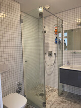 Bad: Bodenebene Dusche, Waschtisch und WC