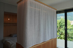 Beschattung: Raffstore rundum plus Verdunkelungsvorhänge in Leinen