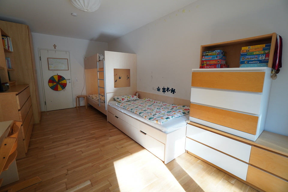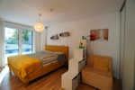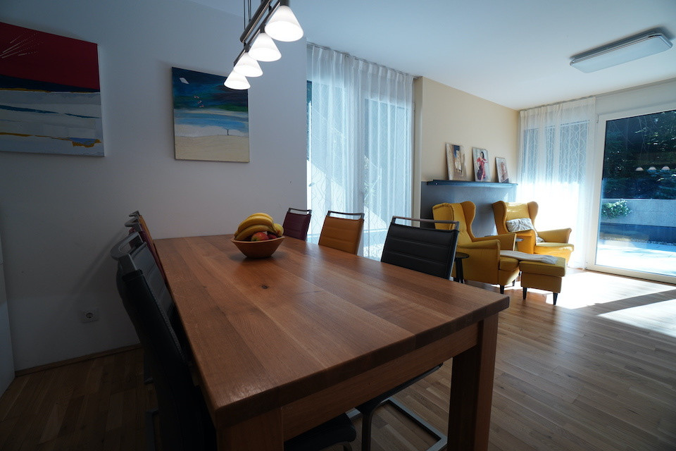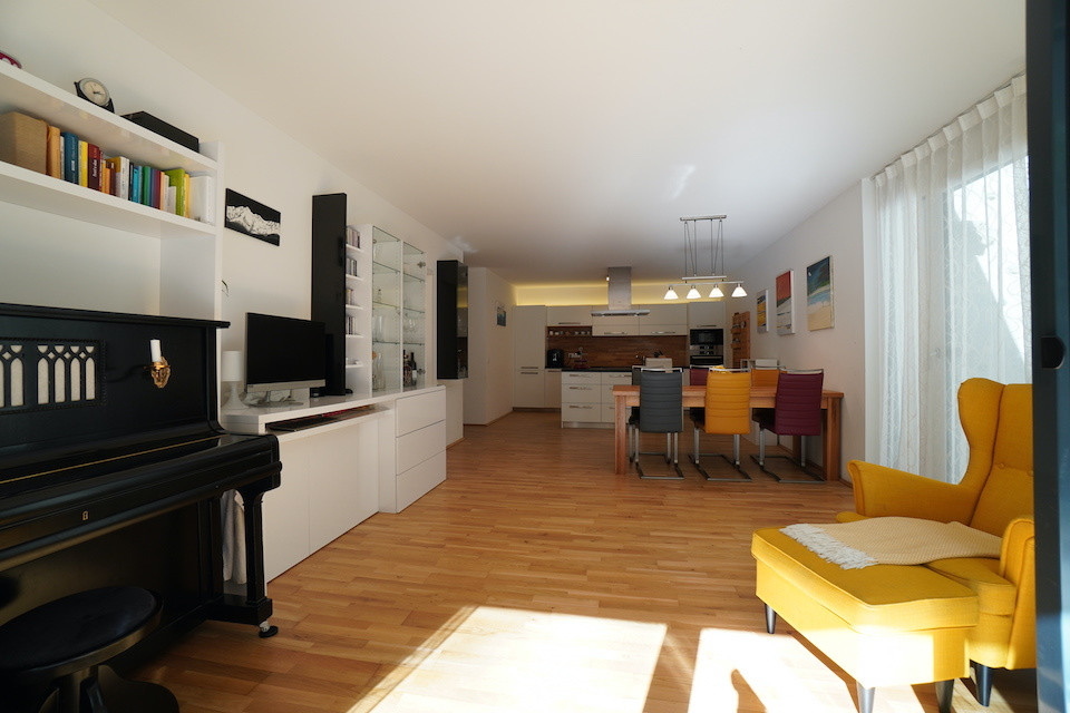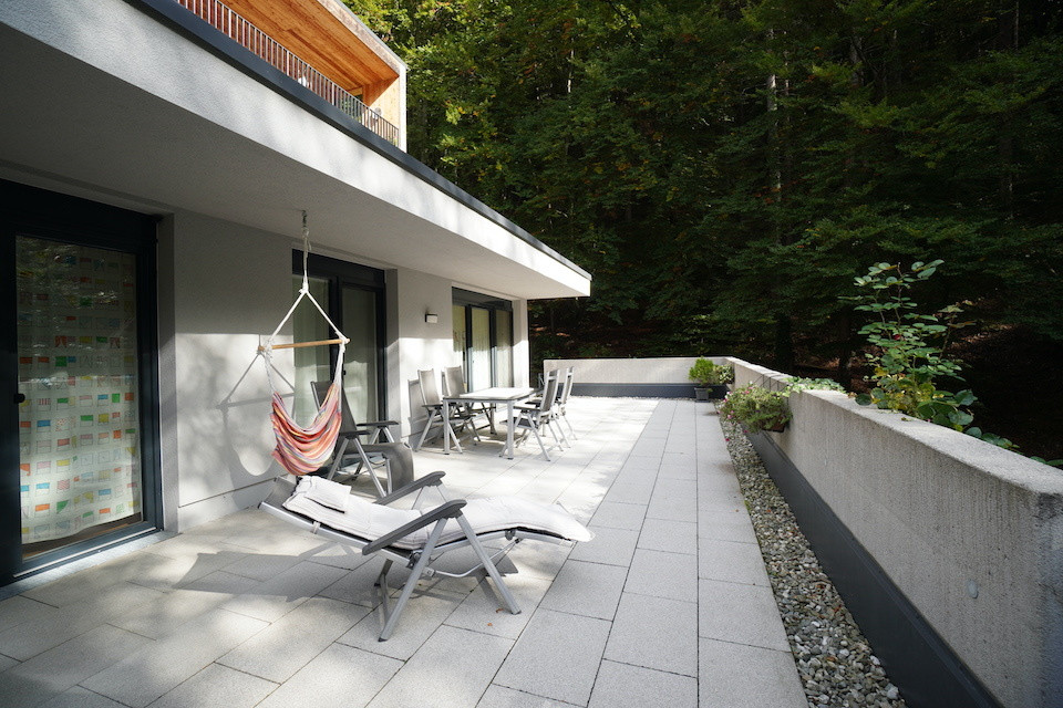 Die 3 Zimmer-Wohnung mit 93m² verfügt über zwei Schlafzimmer, einen geräumigen Wohnbereich, sowie eine bewährte Trennung von Bad und WC. Die funktionelle Küche mit einer modernen Kochinsel ist offen gestaltet, der gemütliche Esstisch dient als Zentrum für die Familie. Die außergewöhnlich große Terrasse mit direktem Zugang und der kleine, durch die Böschung entstandene Garten, bieten eine besondere Atmosphäre, im Einklang mit der Natur.