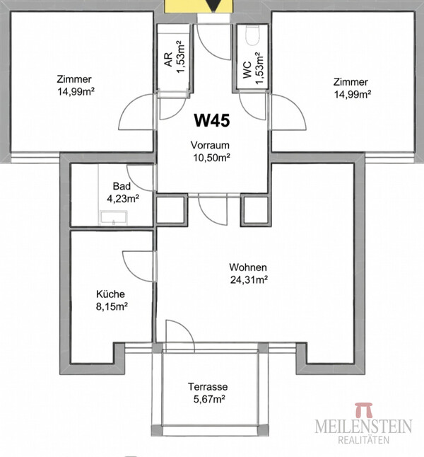 Die Wohnung überzeugt durch ihre großzügige Raumaufteilung mit zwei Schlafzimmern, einer geräumigen Garderobe sowie einem hellen Wohn- und Essbereich. Badezimmer und WC sind getrennt angelegt, zusätzlich bietet ein praktischer Abstellraum wertvollen Stauraum. Die ostseitig ausgerichtete Terrasse lädt zum Entspannen ein. Bei Bedarf kann das Wohnzimmer abgetrennt werden, wodurch ein weiteres Schlafzimmer geschaffen werden kann.