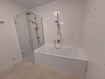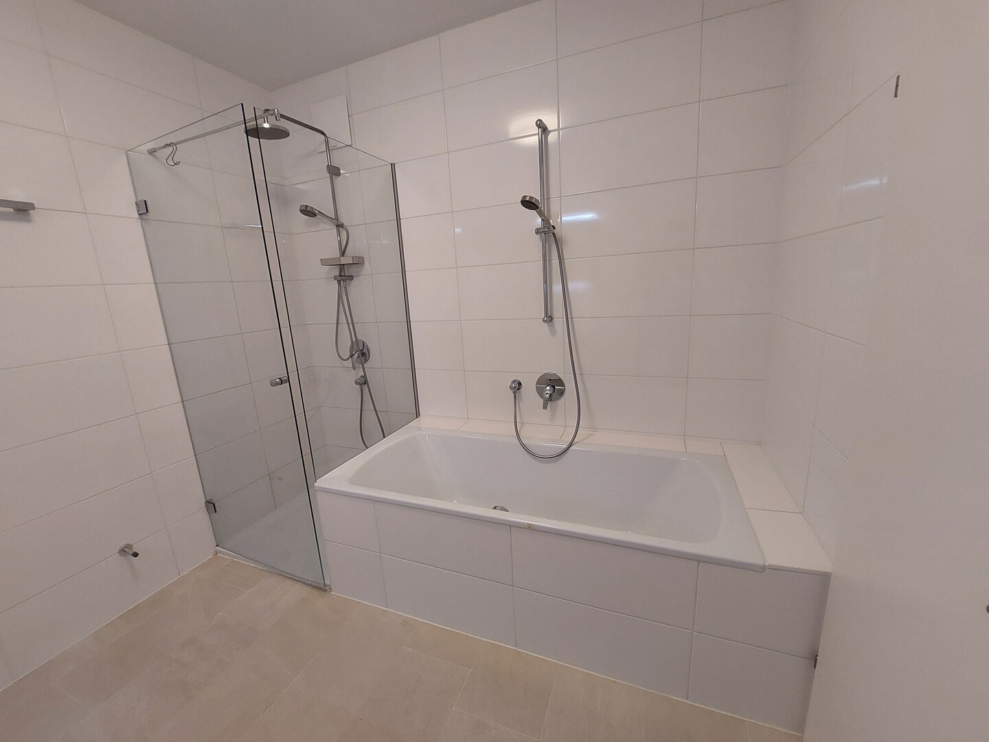 Das Badezimmer verfügt über eine Badewanne UND eine bodenbündige verglaste Dusche.