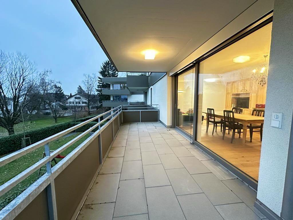 Vom Balkon aus richtet sich der Blick wohltuend und unbebaut in die weite Grünlandschaft und das gesetzte Wohngebiet.