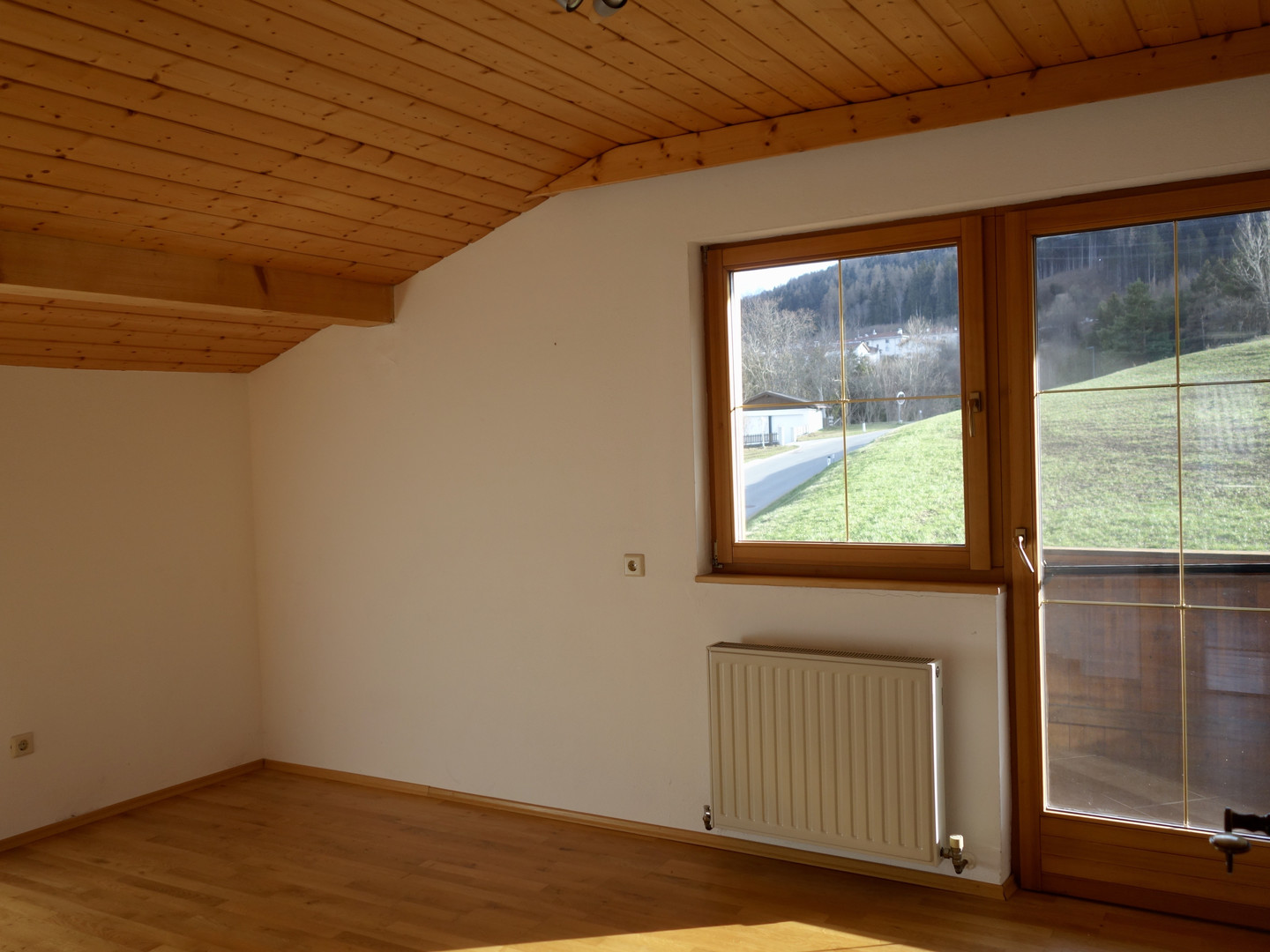 Die 2 Zimmer Wohnung befindet sich im 2.Stock in einem Einfamilienhaus. Die Wohnung verfügt über 1 Wohnzimmer, 1 Schlafzimmer mit Abstellraum, 1 großes Zimmer mit Dachschräge, 1 Küche mit Eckbank, 1 Bad mit Dusche, 1 extra Toilette, 2 heimelige Balkone, 1 Waschküche sowie 1 Stellplatz.
