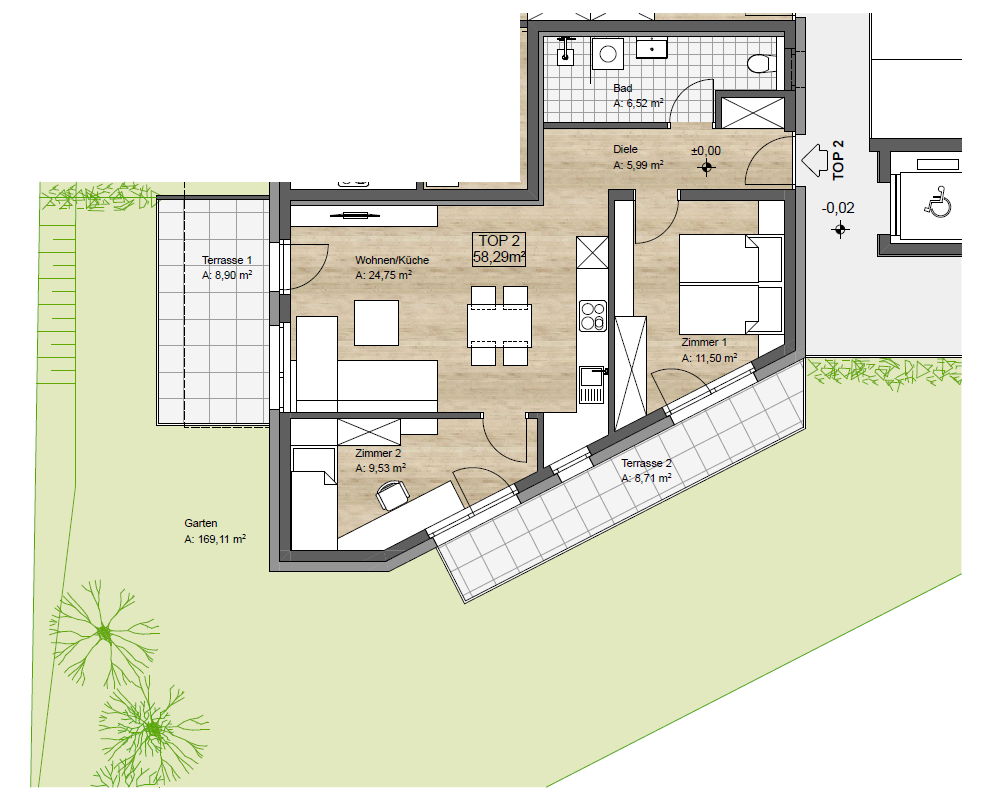 Im darüberliegenden Erdgeschoss befinden sich zwei ca. 60m2 große 3-Zimmer Wohneinheiten mit großzügigen Terrassen- und umlaufenden Gartenflächen.