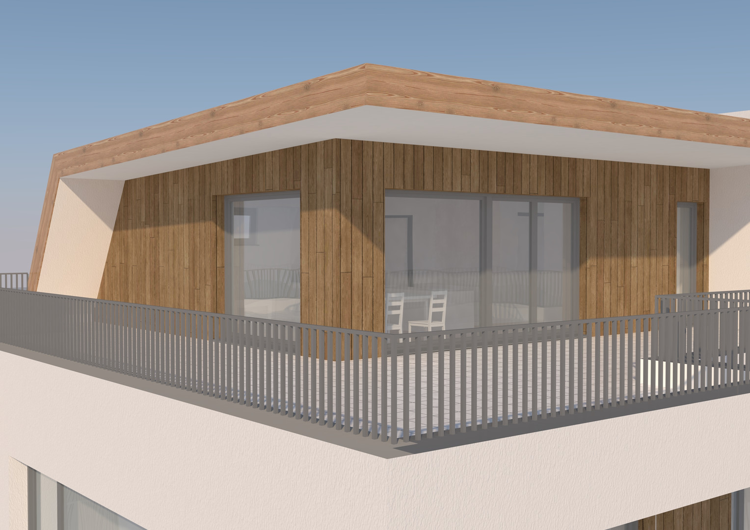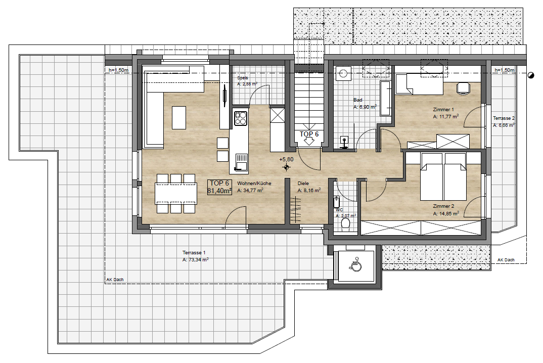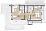 Das Sahnestück der Anlage bildet ein „echtes“ Penthouse im Dach- bzw. 2. Obergeschoss. Die rund 82m2 Wohnfläche erstrecken sich über das komplette oberste Geschoss, ein mittig integrierter Gangbereich verbindet und trennt zugleich die Schlafräume von Wohn- und Essbereich. Abgerundet wird dies Paket durch die großflächig dimensionierte und sonnenverwöhnte Dachterrasse.