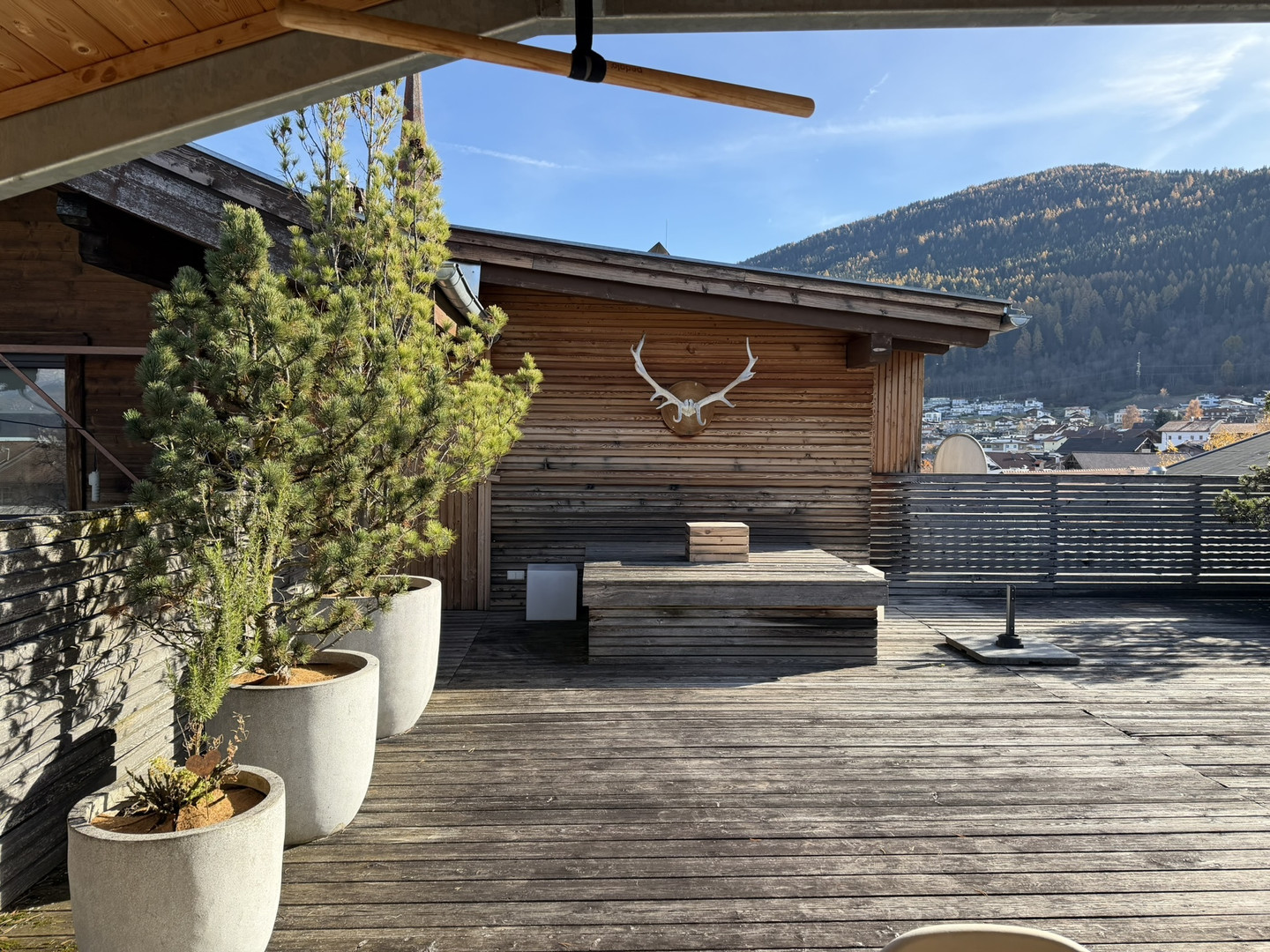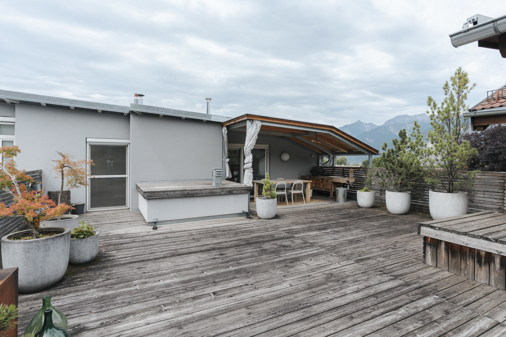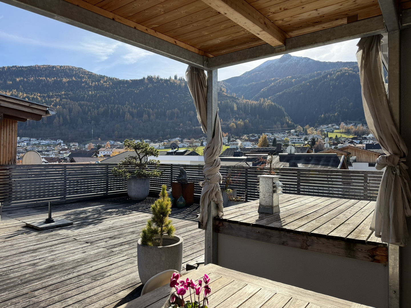 Ihre Dachterrasse ist ein echtes „zweites Wohnzimmer“: viel Privatsphäre, Platz für Lounge & Essbereich – und ein Ausblick Richtung Axamer Lizum sowie bis zur Bergisel-Schanze in Innsbruck.