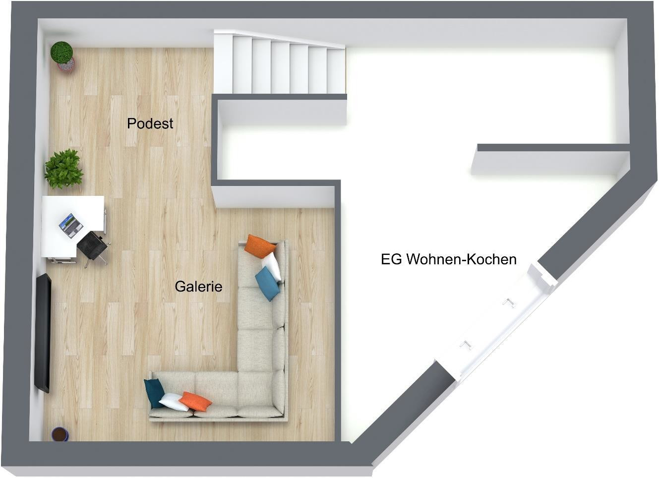 Die elegante Holztreppe führt hinauf zur Galerie, die einen besonderen Akzent setzt und vielfältige Nutzungsmöglichkeiten bietet – ob als Arbeitsbereich, Leseecke oder zusätzlicher Rückzugsraum. Ein Gäste-WC ergänzt diese Ebene ideal.