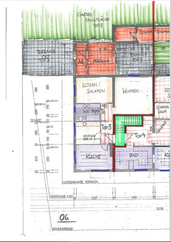 Durch die großflächigen Fenstertüren gelangen sie direkt auf die südlich angelegte Terrasse, der dieser Wohneinheit zugeteilten Nebenräumlichkeiten (Abstellraum, Pergola, Lager) sowie einer kleinen Ostterrasse.