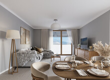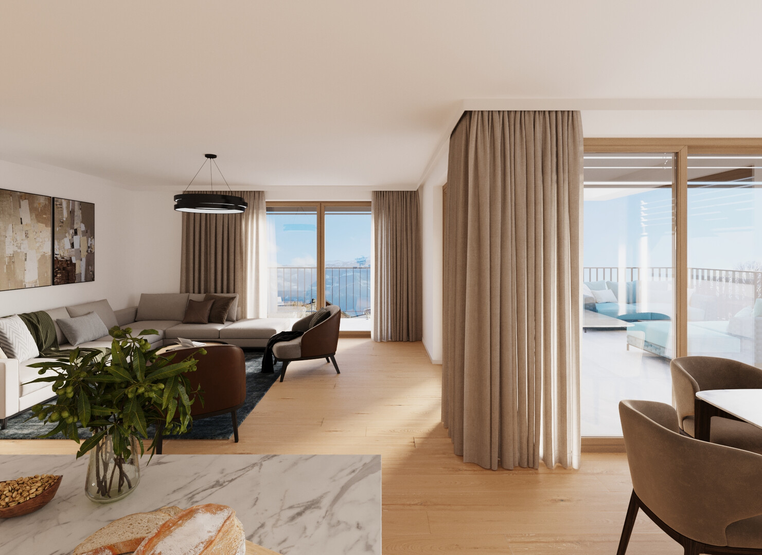 Der helle und offene Wohn-, Koch- und Essbereich liegt vorteilhaft im vorderen Bereich der Einheit und bietet viel Platz für den Alltag und gemeinsames Beisammensein. Ein direkter Zugang zu der Terrasse und dem Garten ist gegeben.