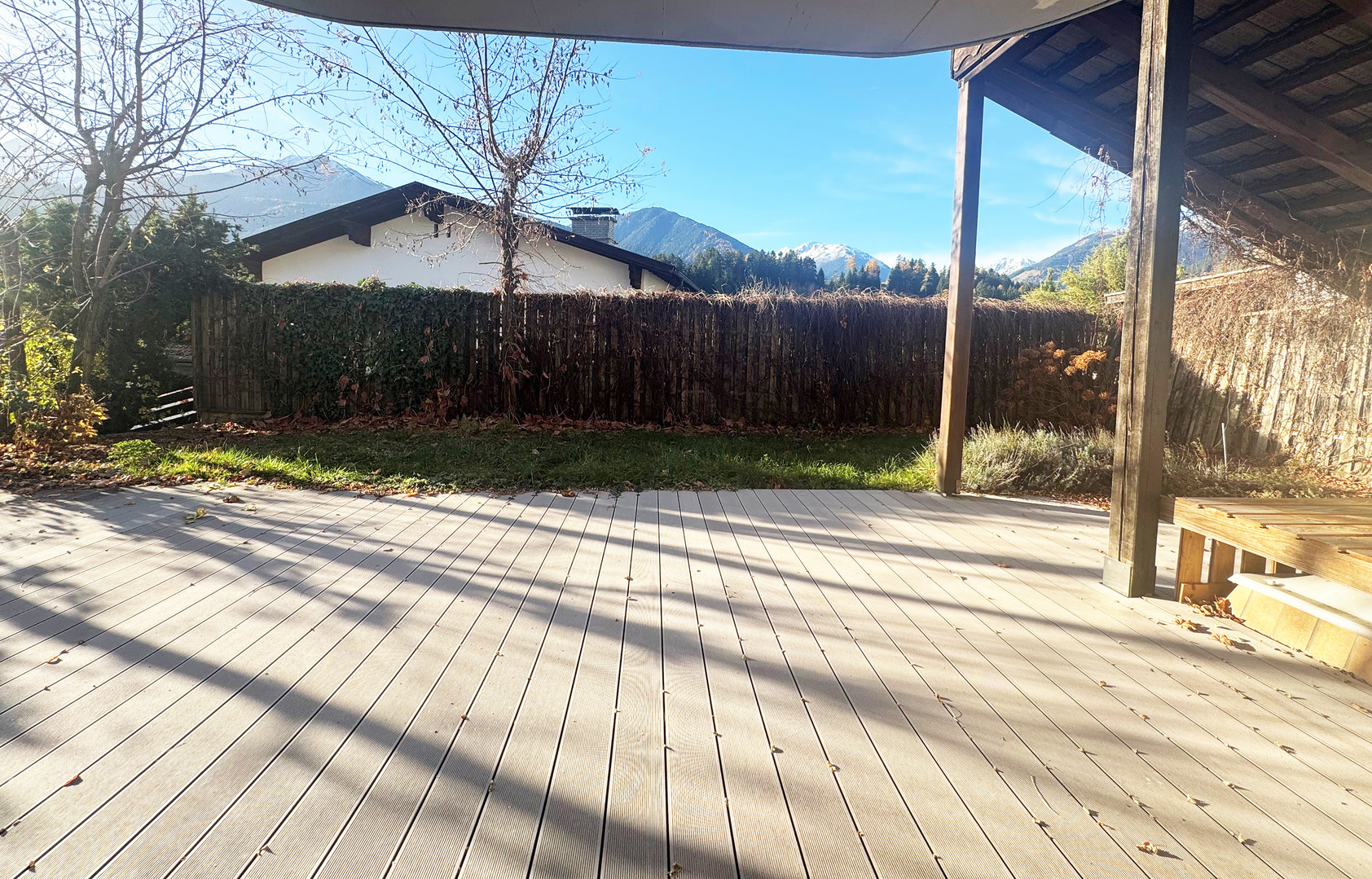 den südwestlich ausgerichteten Garten. Ein Teil der Terrasse ist überdacht