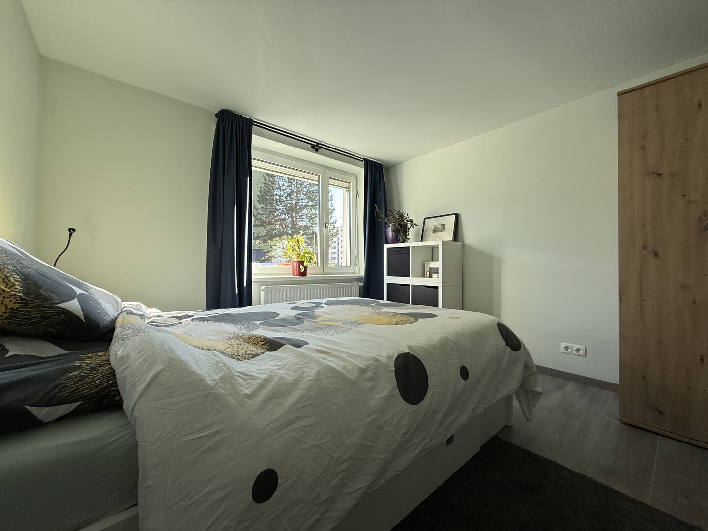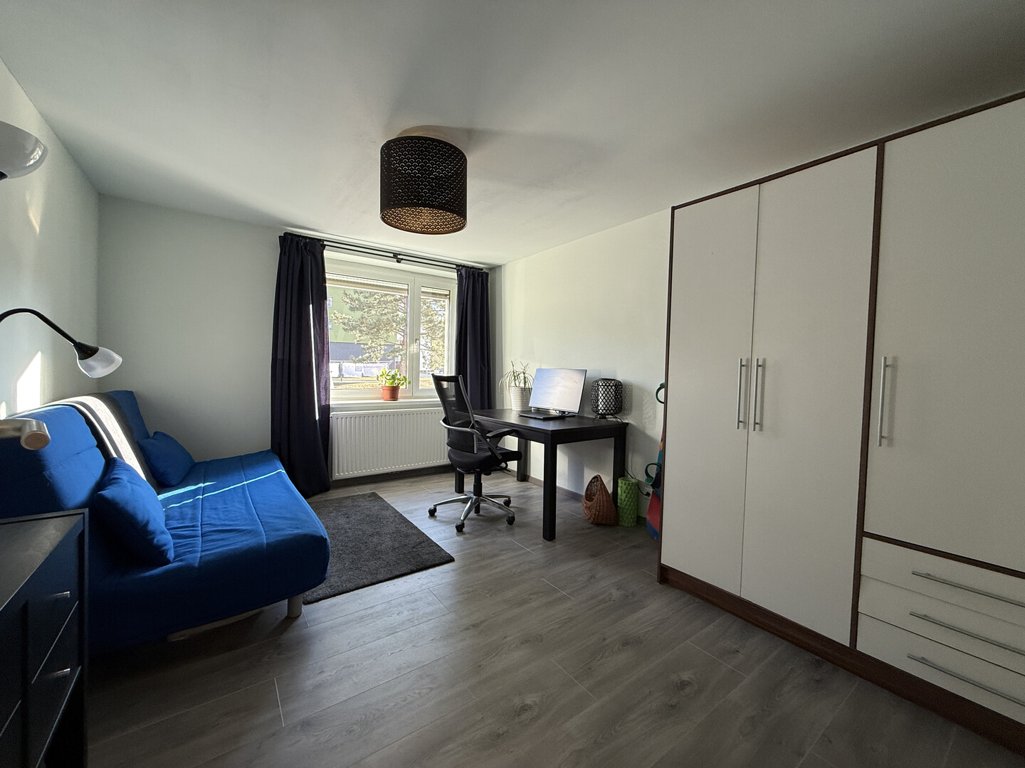 Von hier aus gelangen Sie in das erste von zwei Schlafzimmern, welches wahlweise auch als Arbeits- oder Kinderzimmer Verwendung finden könnte.